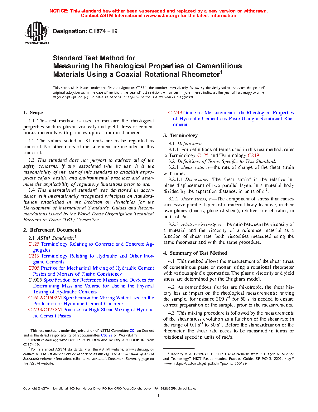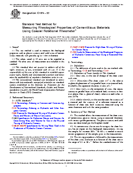 1.1 This test method is used to measure the rheological properties such as plastic viscosity and yield stress of cementitious materials with particles up to 1 mm in diameter.