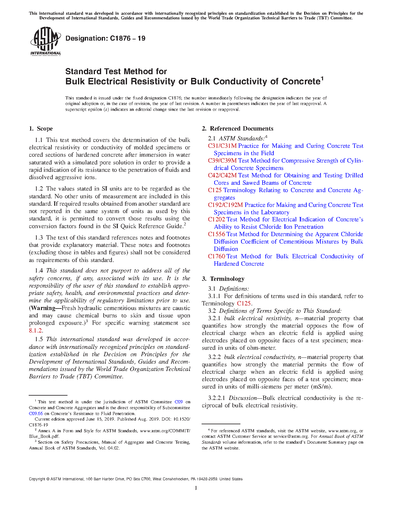 5.4 The bulk electrical resistivity or conductivity of concrete can provide a rapid indication of its resistance to chloride ion penetration and resistance to penetration of other fluids. Resistivity or conductivity measurements have shown good correlations with other electrical indication tests including Test Method C1202 (1, 2, 3).6 Bulk electrical resistivity results have shown good correlation with bulk diffusion determined using Test Method C1556 on companion molded cylinders from the same concrete mixtures (4).