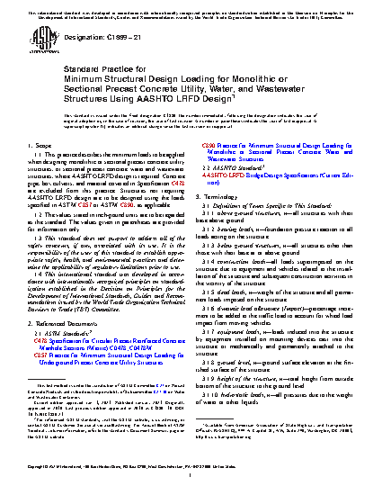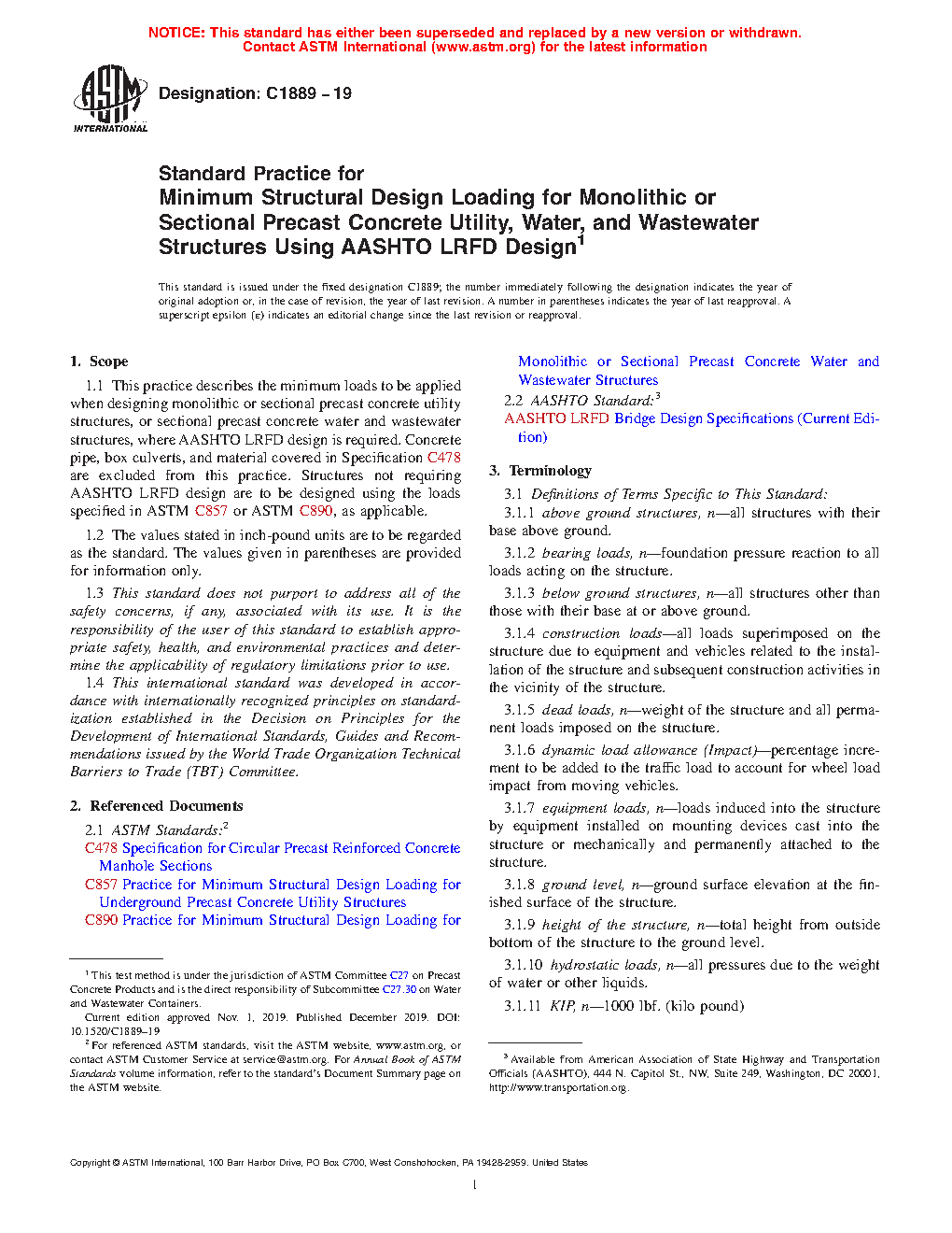 1.1 This practice describes the minimum loads to be applied when designing monolithic or sectional precast concrete utility structures, or sectional precast concrete water and wastewater structures, where AASHTO LRFD design is required. Concrete pipe, box culverts, and material covered in Specification C478 are excluded from this practice. Structures not requiring AASHTO LRFD design are to be designed using the loads specified in ASTM C857 or ASTM C890, as applicable.