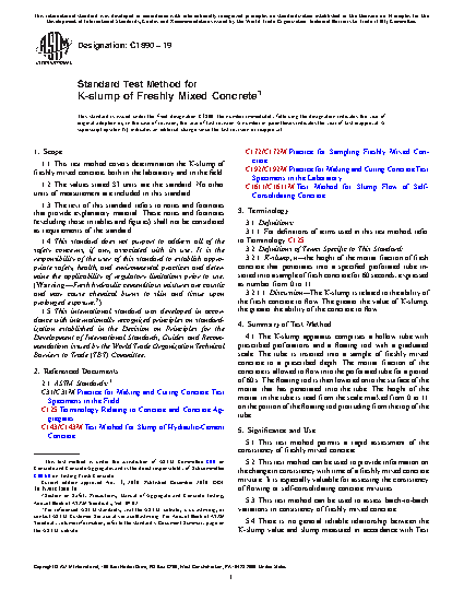 5.4 There is no general reliable relationship between the K-slump value and slump measured in accordance with Test Method C143/C143M or slump flow measured in accordance with Test Method C1611/C1611M. However, this test method is useful as a quality control tool. For example, the user can make trial batches in the laboratory and determine the range in K-slump corresponding to an acceptable range in slump or slump flow. That range in K-slump can be used to check the consistency of field batches.
