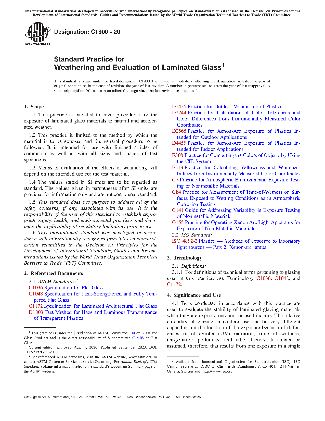 1.1 This practice is intended to cover procedures for the exposure of laminated glass materials to natural and accelerated weather.