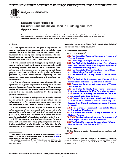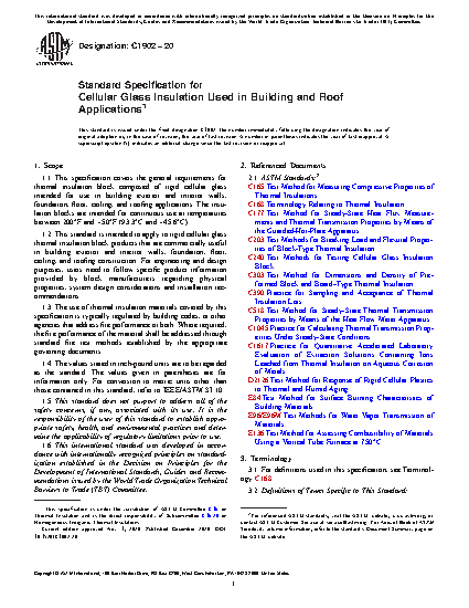 1.1 This specification covers the general requirements for thermal insulation block composed of rigid cellular glass intended for use in building exterior and interior walls, foundation, floor, ceiling, and roofing applications. The insulation blocks are intended for continuous use at temperatures between 200°F and -50°F (93.3°C and -45.6°C).