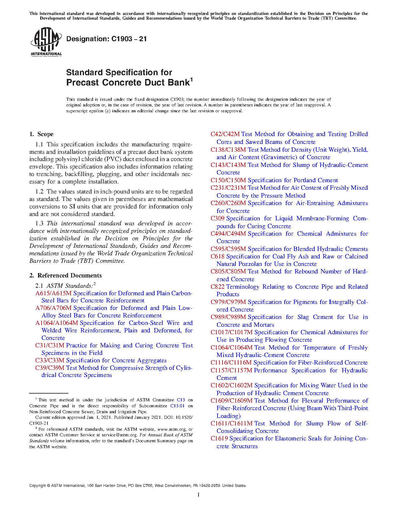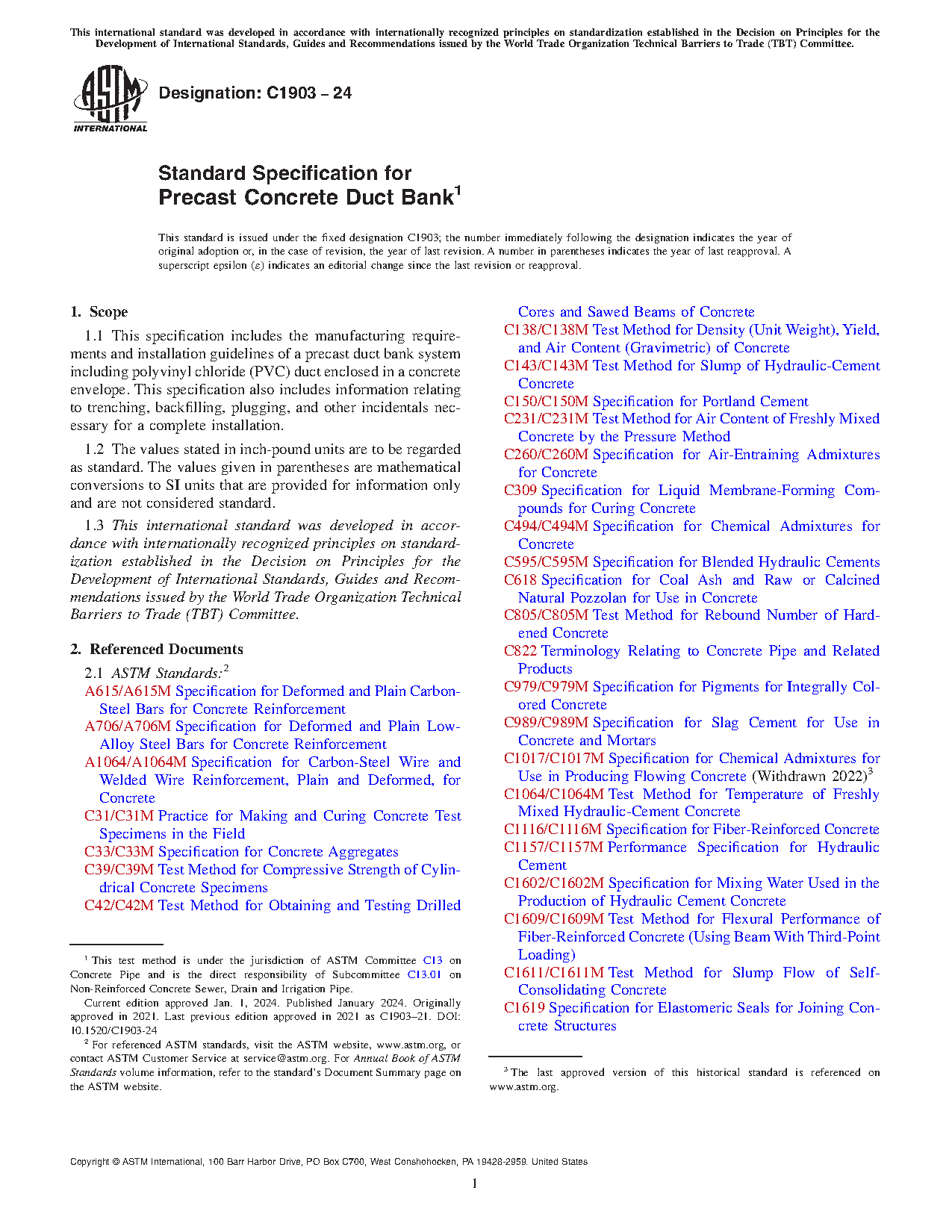 1.1 This specification includes the manufacturing requirements and installation guidelines of a precast duct bank system including polyvinyl chloride (PVC) duct enclosed in a concrete envelope. This specification also includes information relating to trenching, backfilling, plugging, and other incidentals necessary for a complete installation.
