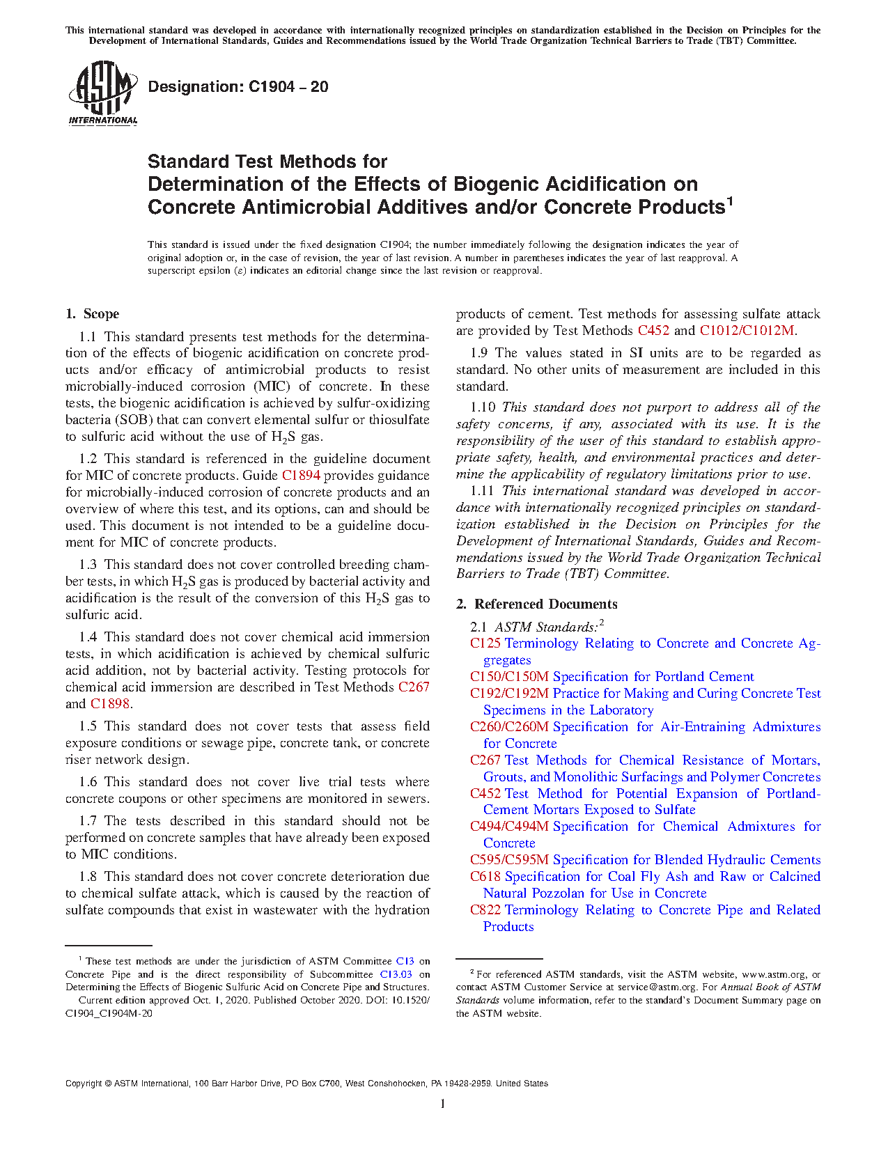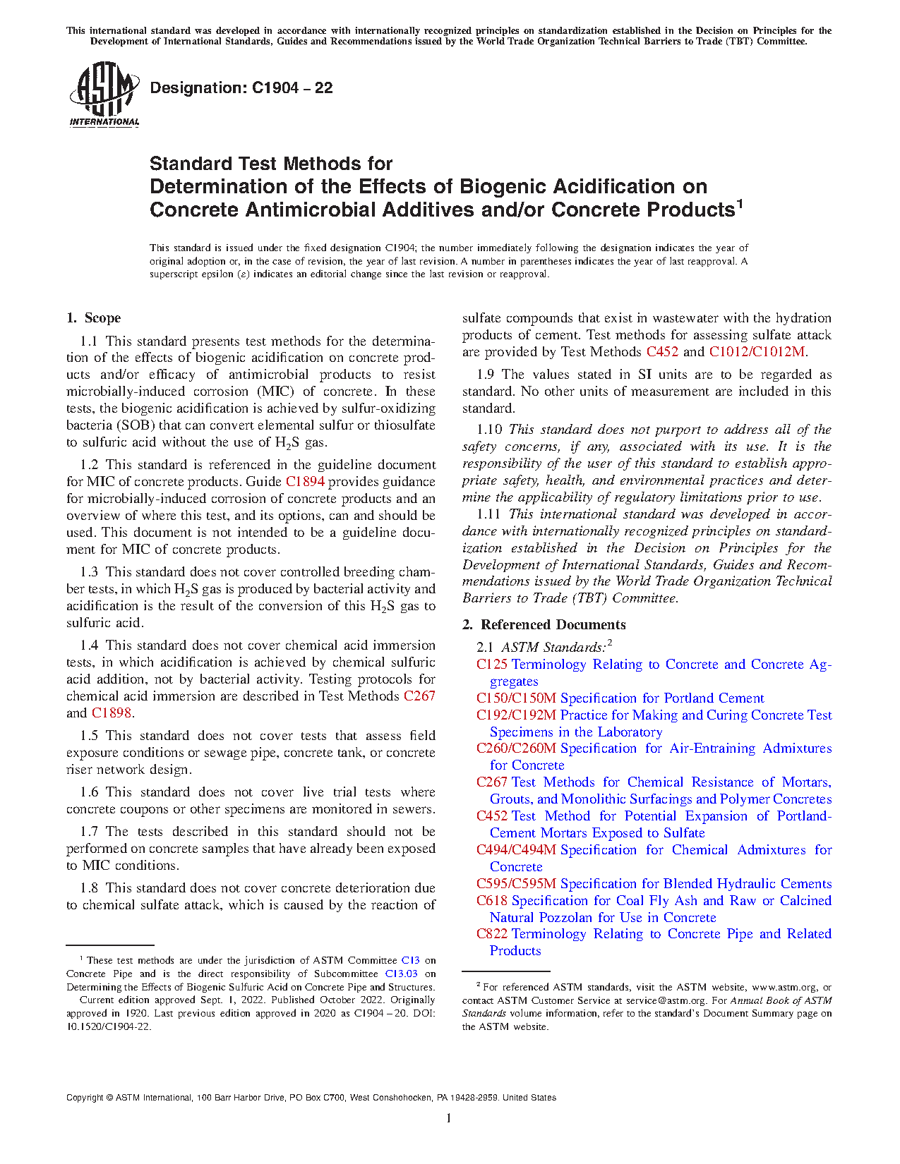 1.4 This standard does not cover chemical acid immersion tests, in which acidification is achieved by chemical sulfuric acid addition, not by bacterial activity. Testing protocols for chemical acid immersion are described in Test Methods C267 and C1898.