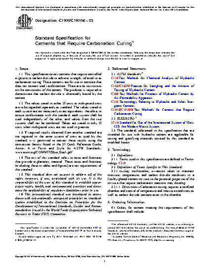 1.1 This specification covers cements that require controlled exposure to carbon dioxide to achieve strength, referred to as carbonation curing. These cements are for use in concrete that does not contain steel reinforcement. There are no restrictions on the constituents of the cement. The producer is required to demonstrate that carbon dioxide is chemically bound by the cement.