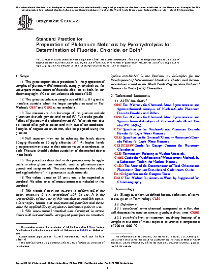 1.1 This practice provides a procedure for the preparation of samples of plutonium (Pu) materials, using pyrohydrolysis, for subsequent measurement of fluoride, chloride, or both, by ion chromatography (IC) or ion-selective electrode (ISE).