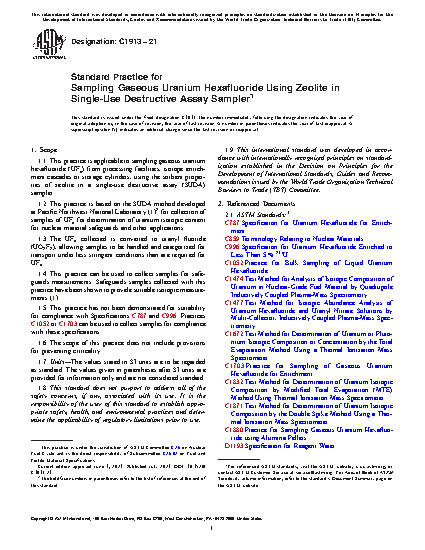 1.1 This practice is applicable to sampling gaseous uranium hexafluoride (UF6) from processing facilities, isotope enrichment cascades or storage cylinders, using the sorbent properties of zeolite in a single-use destructive assay (SUDA) sampler.