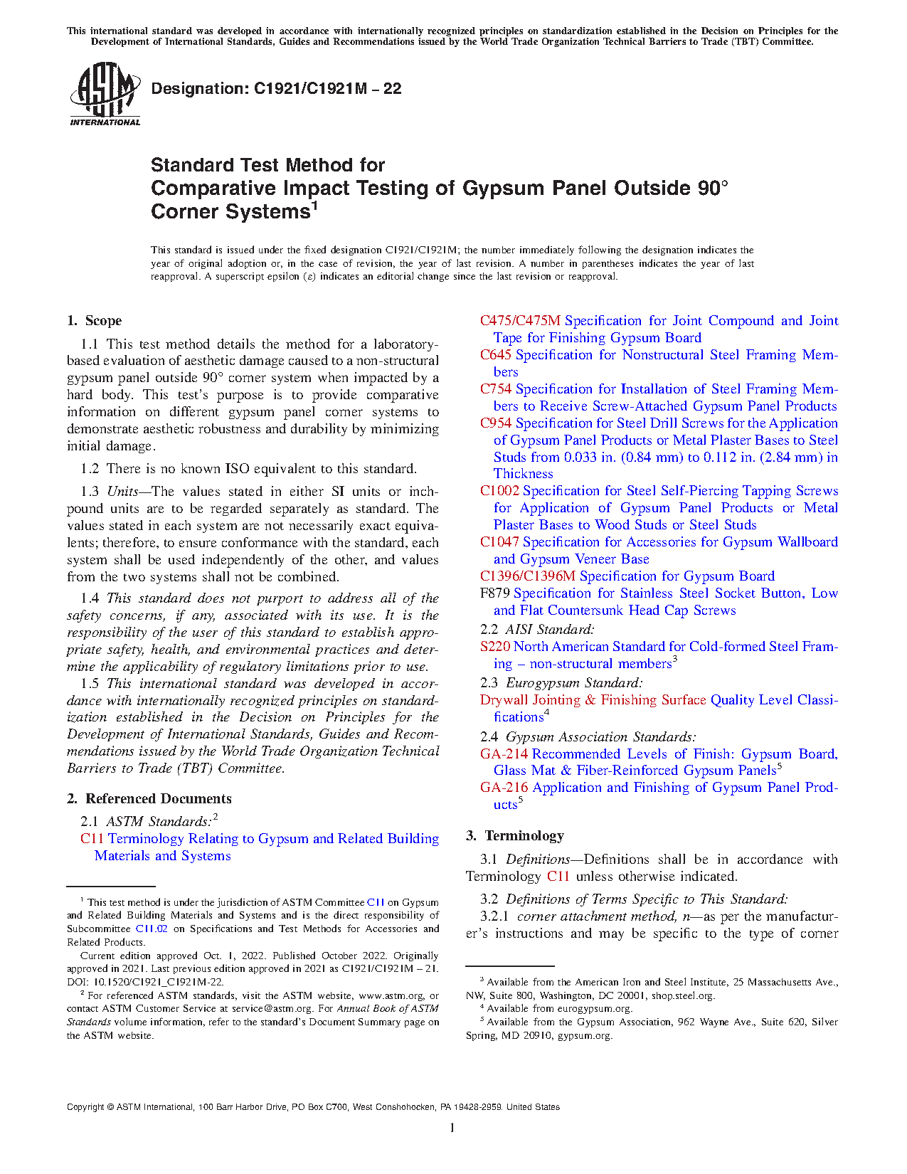1.1 This test method details the method for a laboratory-based evaluation of aesthetic damage caused to a non-structural gypsum panel outside 90° corner system when impacted by a hard body. This test’s purpose is to provide comparative information on different gypsum panel corner systems to demonstrate aesthetic robustness and durability by minimizing initial damage.