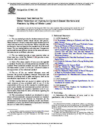 1.1 This test method provides for the determination of water retention of hydraulic cement based mortars and plasters. Water Retention is directly measured through the absorption of water from the mortar by the substrate. Various substrates may be chosen by the user based on the intended use of the tested mortar. This test method defines such substrates. Comparisons can be made between different mortars on the same substrate or the same mortar on different substrates.