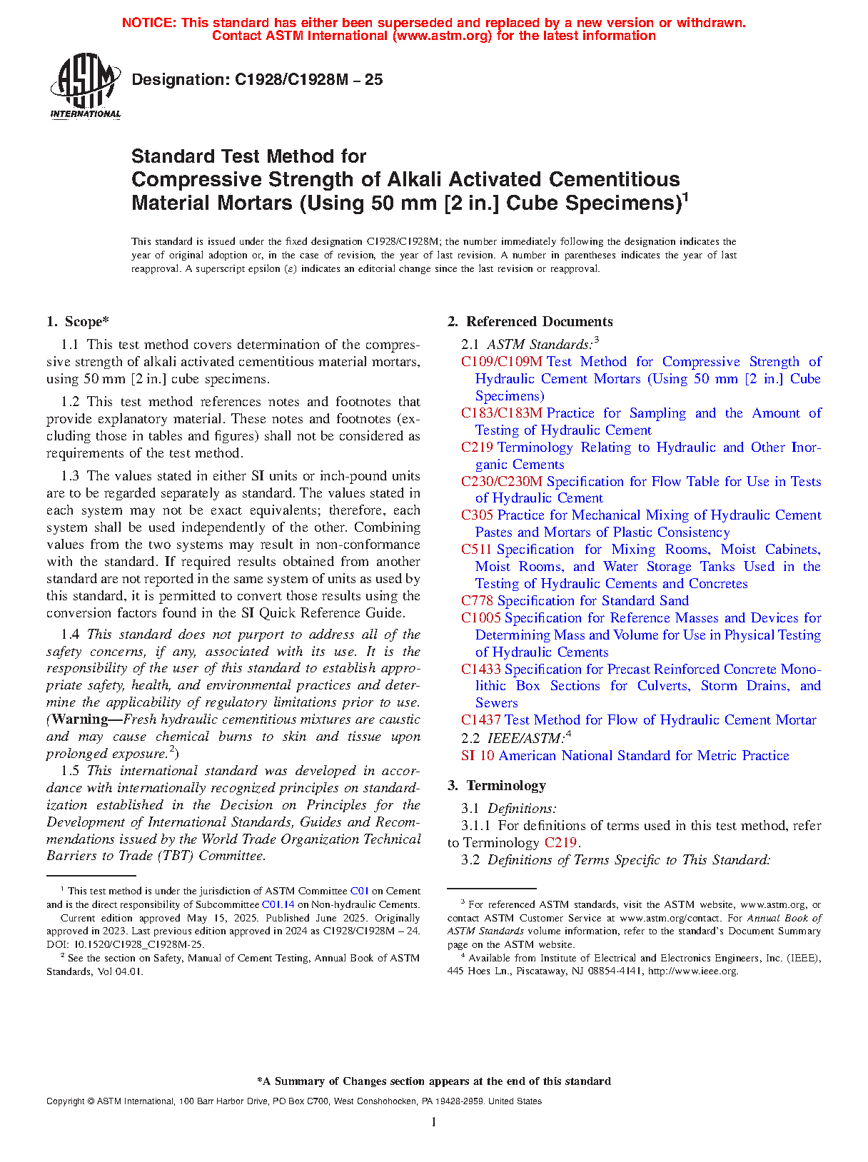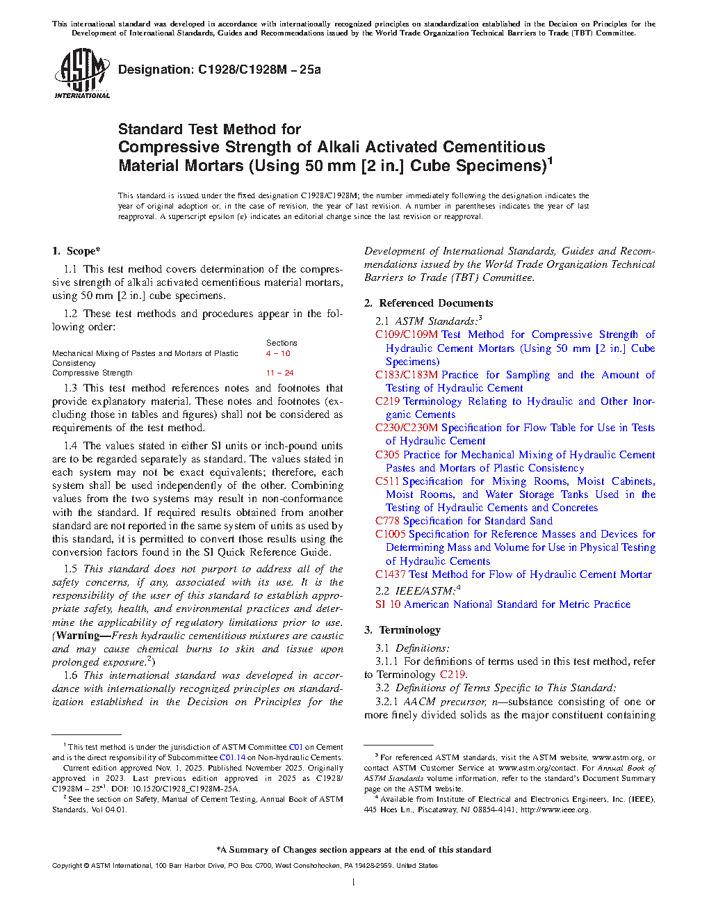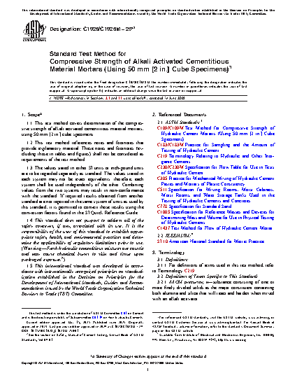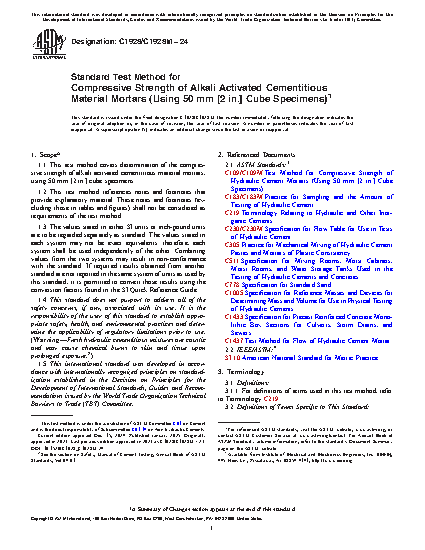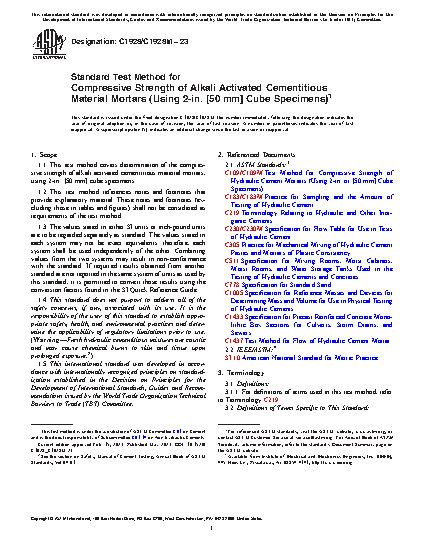 1.1 This test method covers determination of the compressive strength of alkali activated cementitious material mortars, using 50 mm [2 in.] cube specimens.