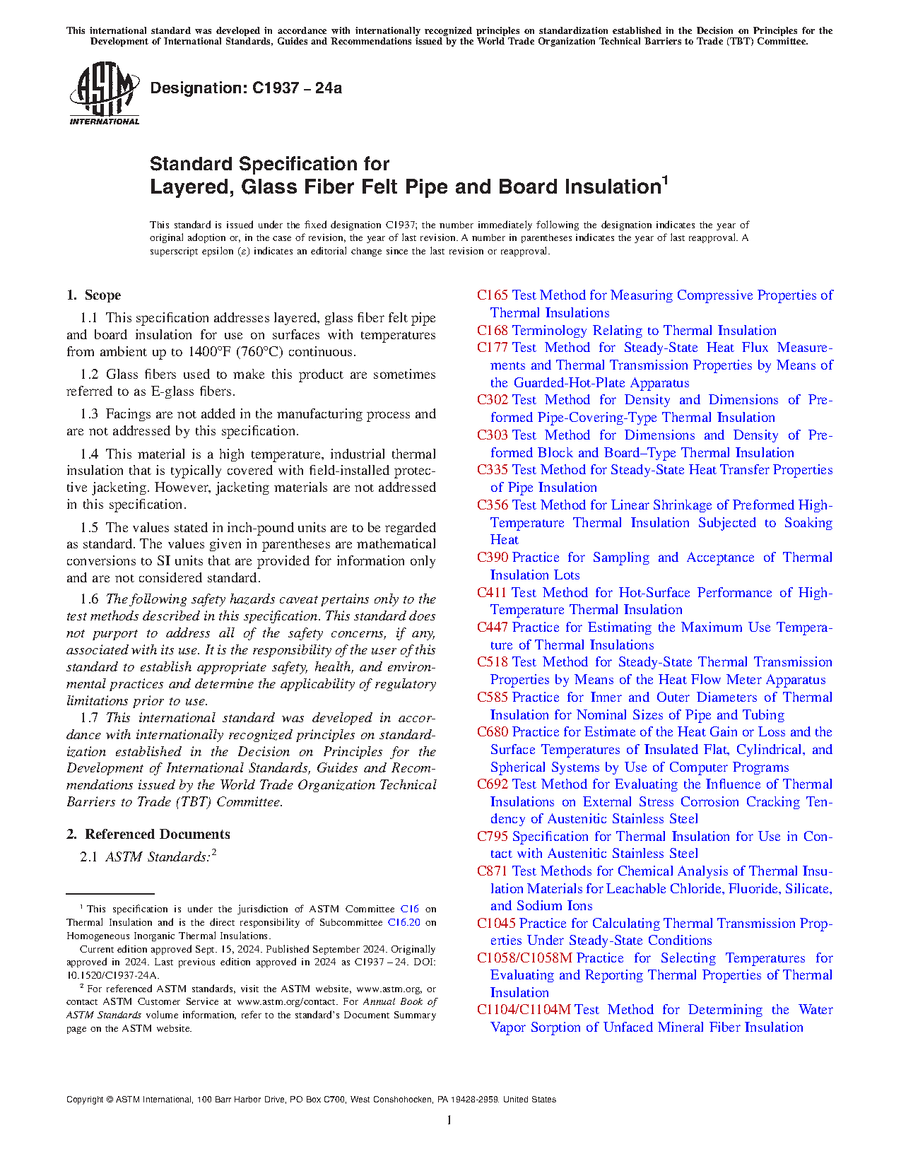 1.1 This specification addresses layered, glass fiber felt pipe and board insulation for use on surfaces with temperatures from ambient up to 1400°F (760°C) continuous.