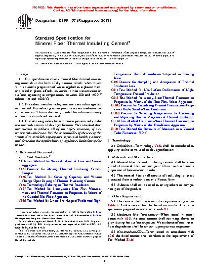 1.1 This specification covers mineral fiber thermal insulating materials in the form of dry cement, which, when mixed with a suitable proportion of water, applied as a plastic mass, and dried in place, affords resistance to heat transmission on surfaces operating at temperatures between 250 and 1900°F (about 121 and 1038°C).