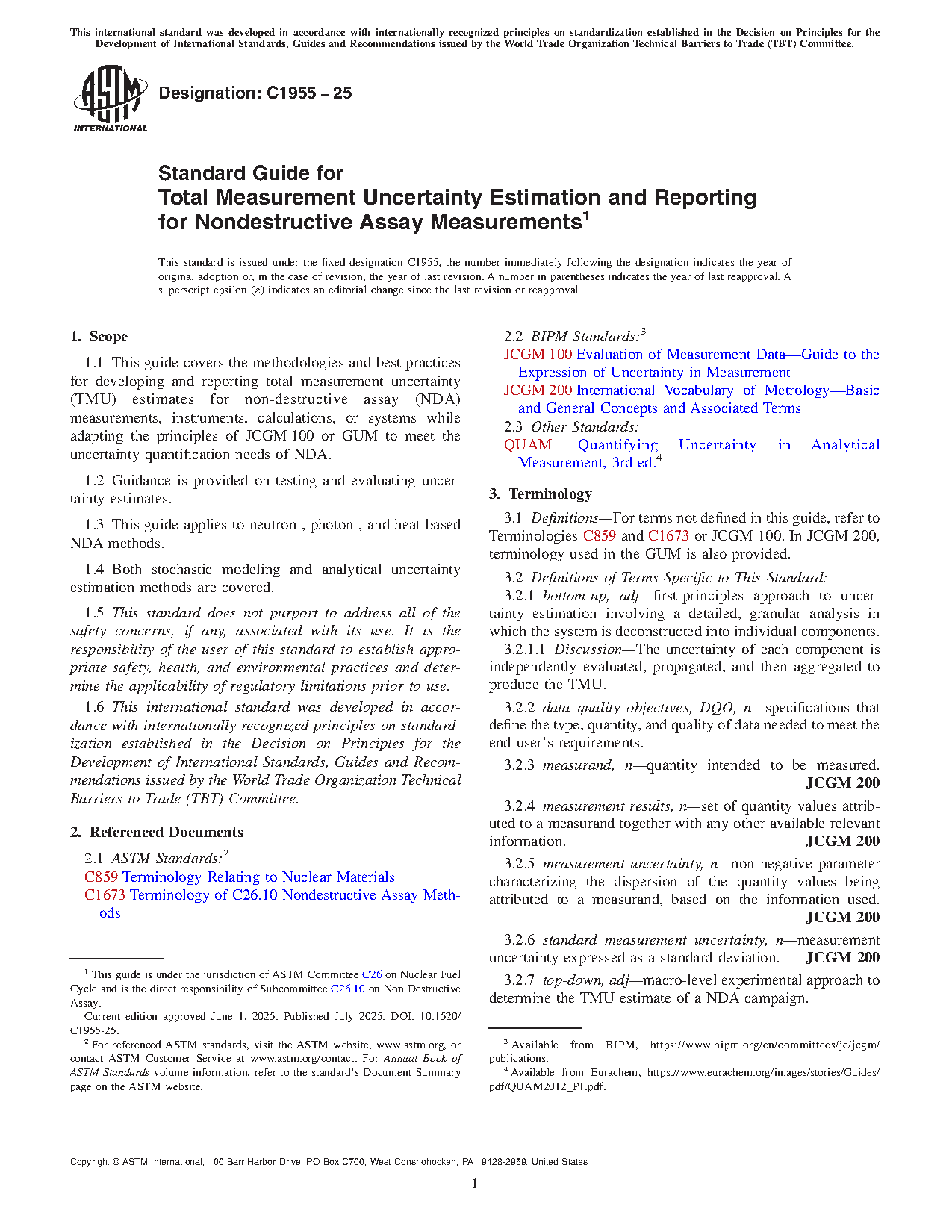 1.1 This guide covers the methodologies and best practices for developing and reporting total measurement uncertainty (TMU) estimates for non-destructive assay (NDA) measurements, instruments, calculations, or systems while adapting the principles of JCGM 100 or GUM to meet the uncertainty quantification needs of NDA.
