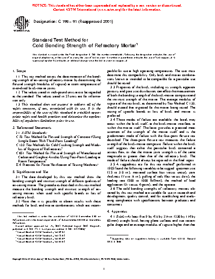 3.6 The cold bonding strengths of refractory mortars obtained by this test method are suitable for use in research and development, quality control, and for establishing and evaluating compliance with specifications between producers and consumers.