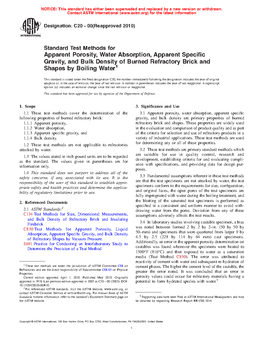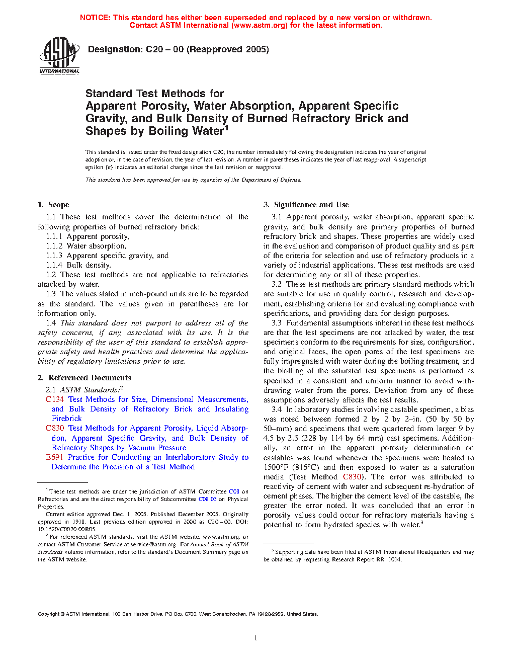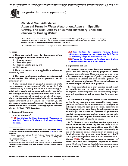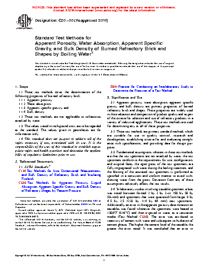 Standard Test Methods for Apparent Porosity, Water Absorption, Apparent Specific Gravity, and Bulk Density of Burned Refractory Brick and Shapes by Boiling Water