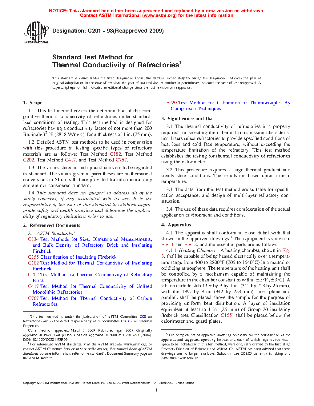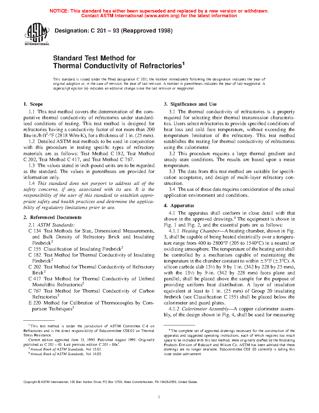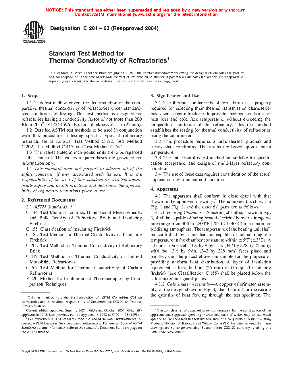 1.1 This test method covers the determination of the comparative thermal conductivity of refractories under standardized conditions of testing. This test method is designed for refractories having a conductivity factor of not more than 200 Btu[dot]in./h[dot]ft [dot]°F (2818 W/m[dot]K), for a thickness of 1 in. (25 mm).