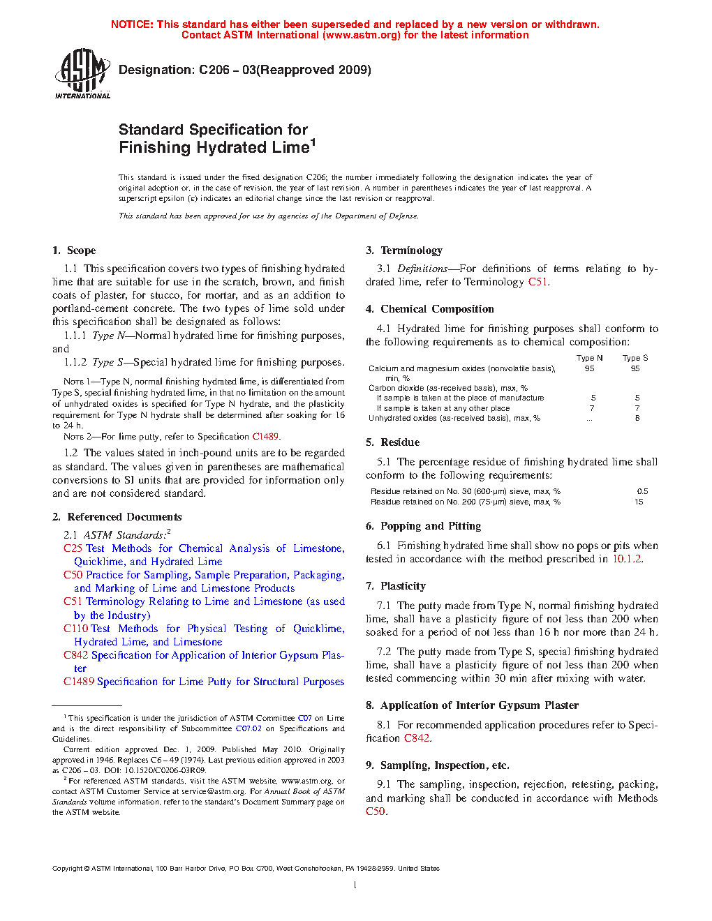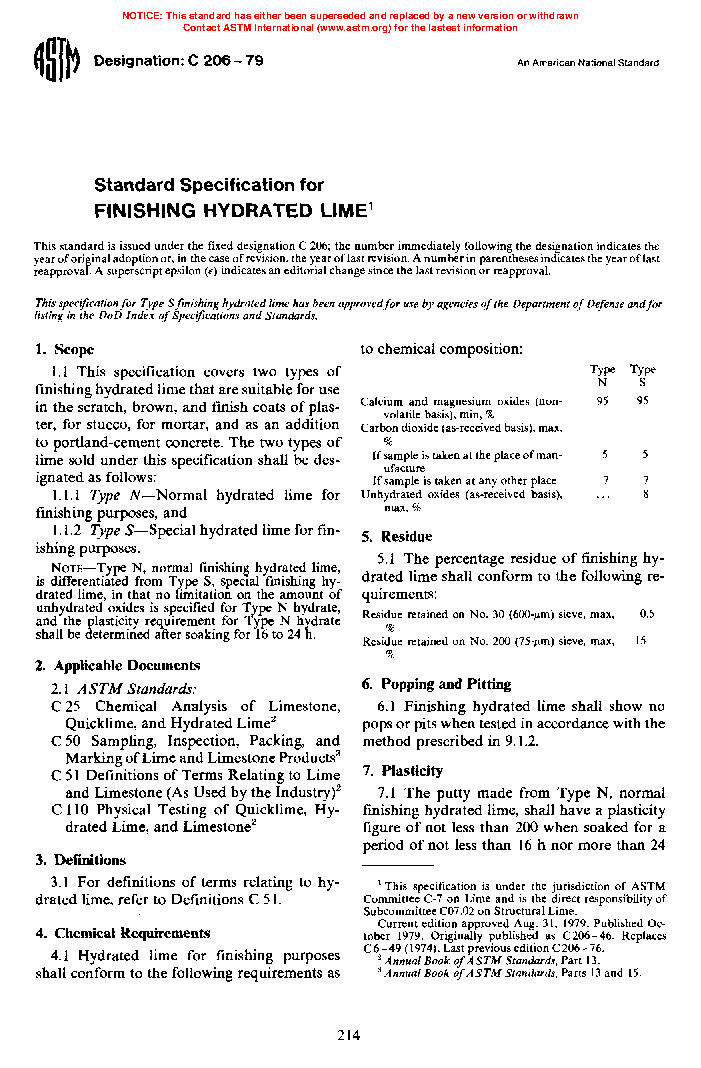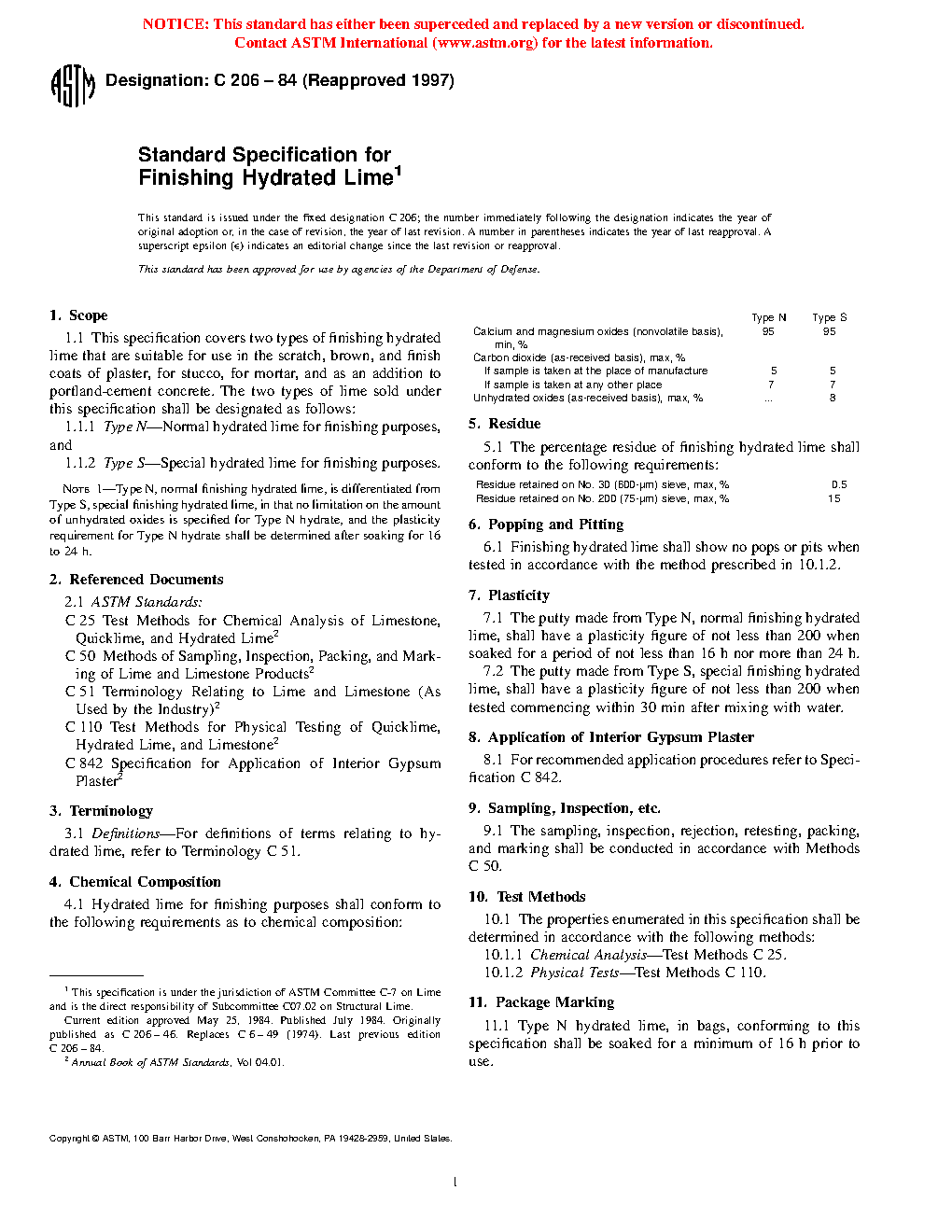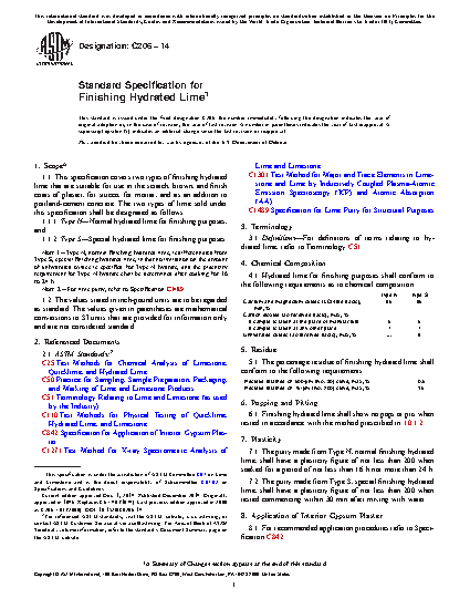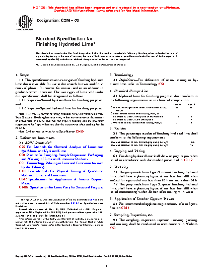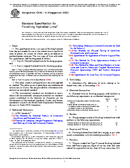 1.1 This specification covers two types of finishing hydrated lime that are suitable for use in the scratch, brown, and finish coats of plaster, for stucco, for mortar, and as an addition to portland-cement concrete. The two types of lime sold under this specification shall be designated as follows: