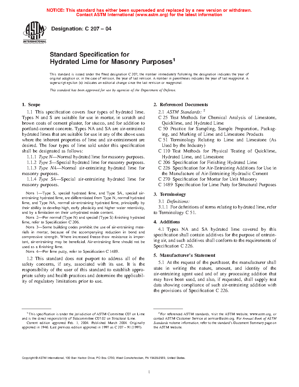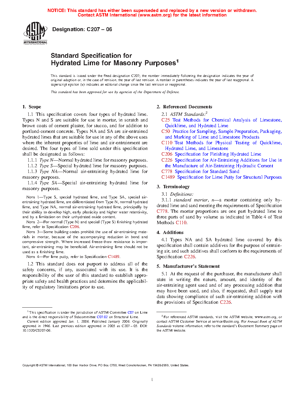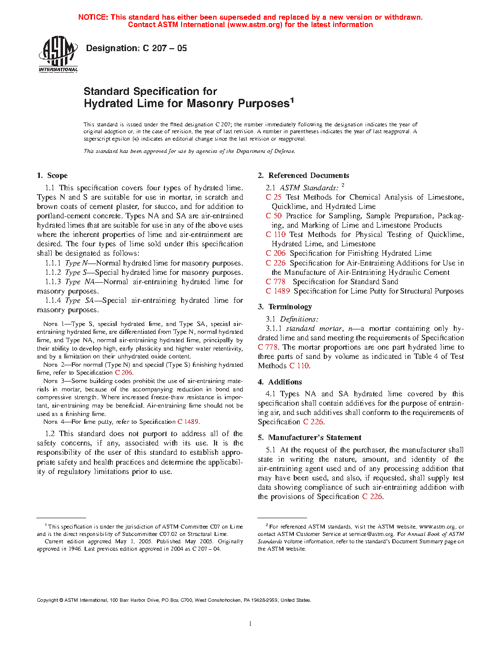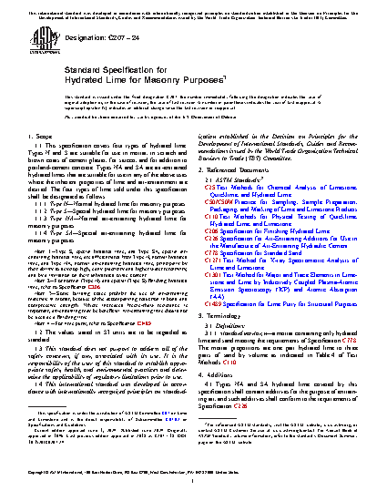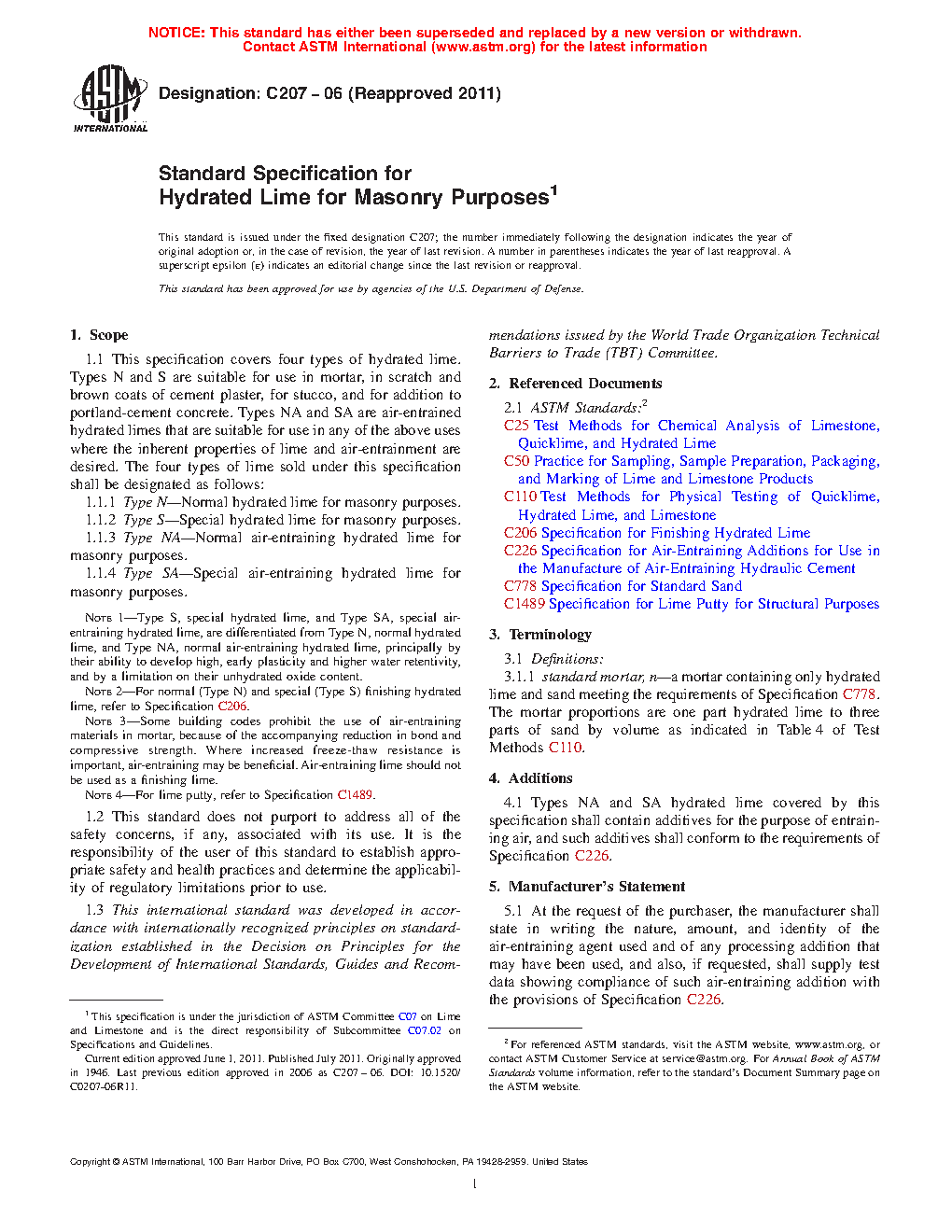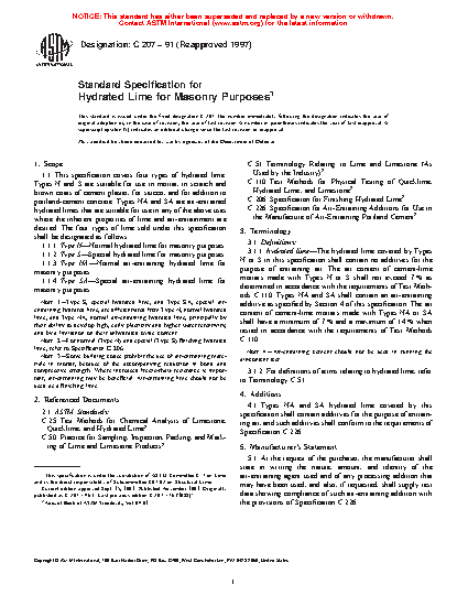 1.1 This specification covers four types of hydrated lime. Types N and S are suitable for use in mortar, in scratch and brown coats of cement plaster, for stucco, and for addition to portland-cement concrete. Types NA and SA are air-entrained hydrated limes that are suitable for use in any of the above uses where the inherent properties of lime and air-entrainment are desired. The four types of lime sold under this specification shall be designated as follows: