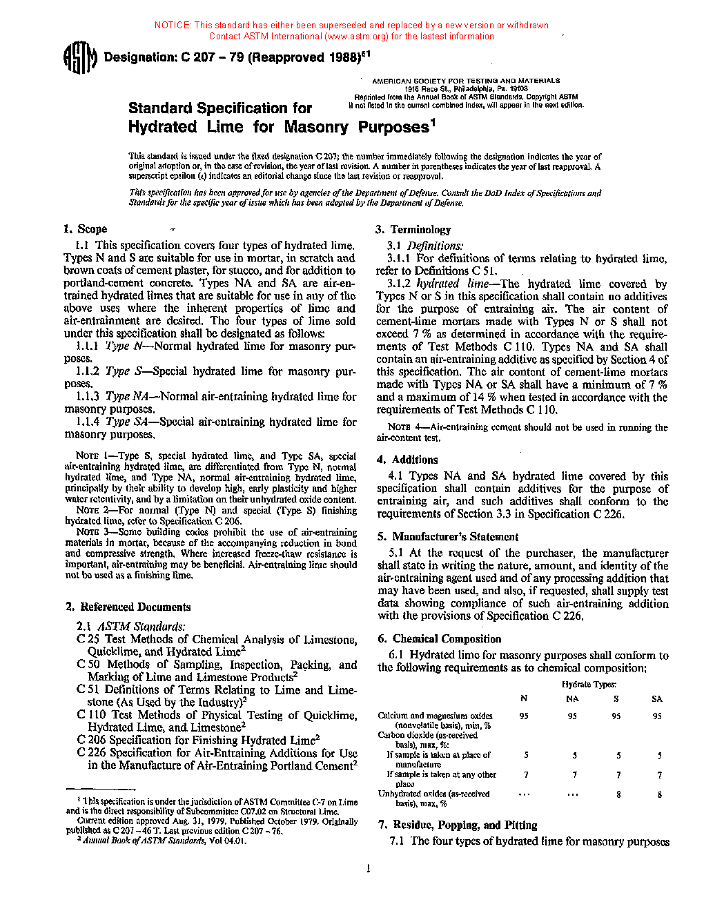 This specification covers four types of hydrated lime. Type N and S are suitable for use in mortar, in scratch and brown coats of cement plaster, for stucco, and for addition to Portland-cement concrete. Types NA and SA are air-entrained hydrated limes that are suitable for use in any of the above uses where the inherent properties of lime and air-entrainment are desired. The four types of lime under this specification shall be designated as Type N which is the normal hydrated lime for masonry purposes, type S which is the special hydrated lime for masonry purposes, type NA which is the normal air-entraining hydrated lime for masonry purposes and type SA which is the special air-entraining hydrated lime for masonry purposes. Hydrated lime for masonry purposes shall conform to the required chemical composition for calcium and magnesium oxides and carbon dioxide. The hydrated lime covered by Types N or S in this specification shall contain no additives for the purpose of entraining air.