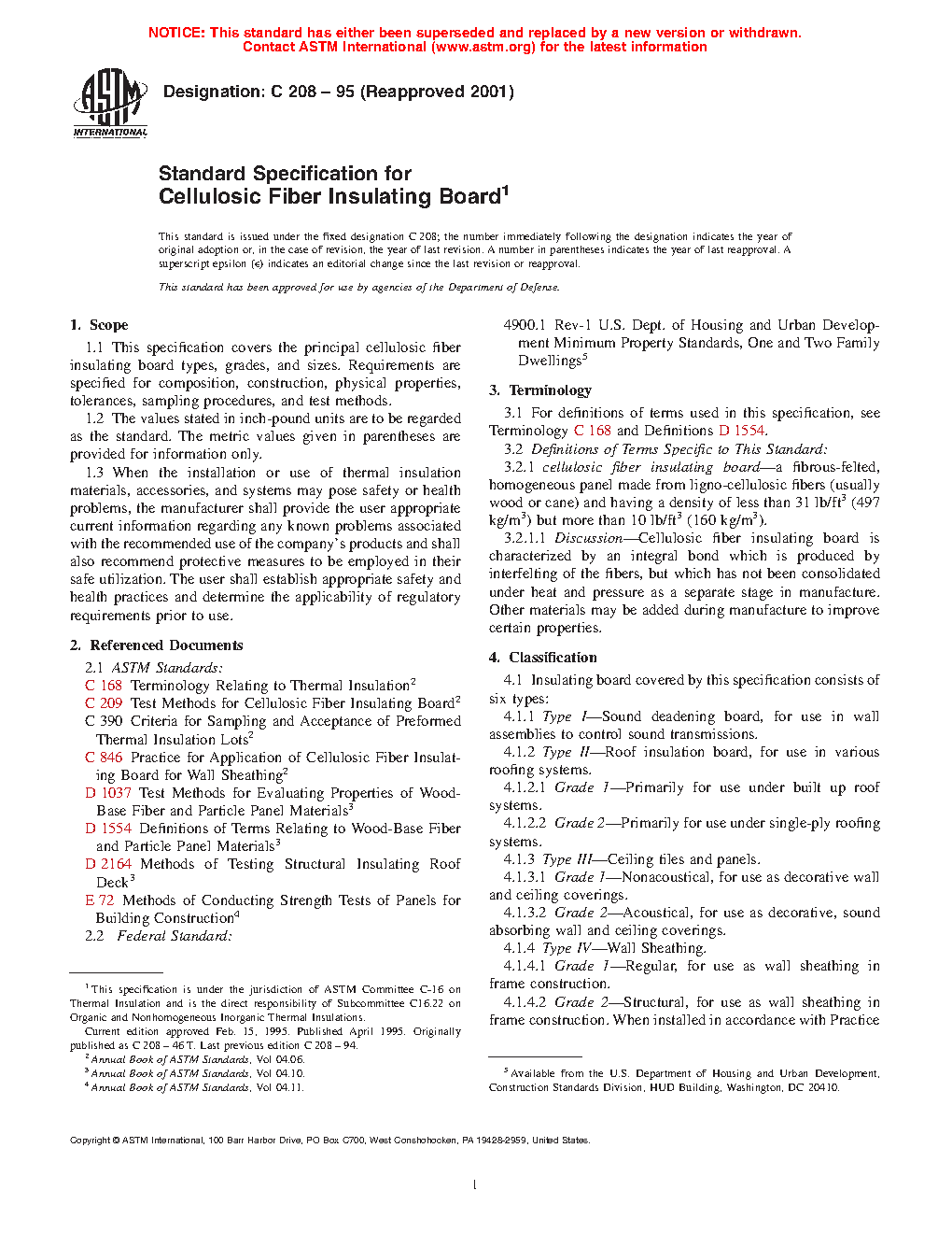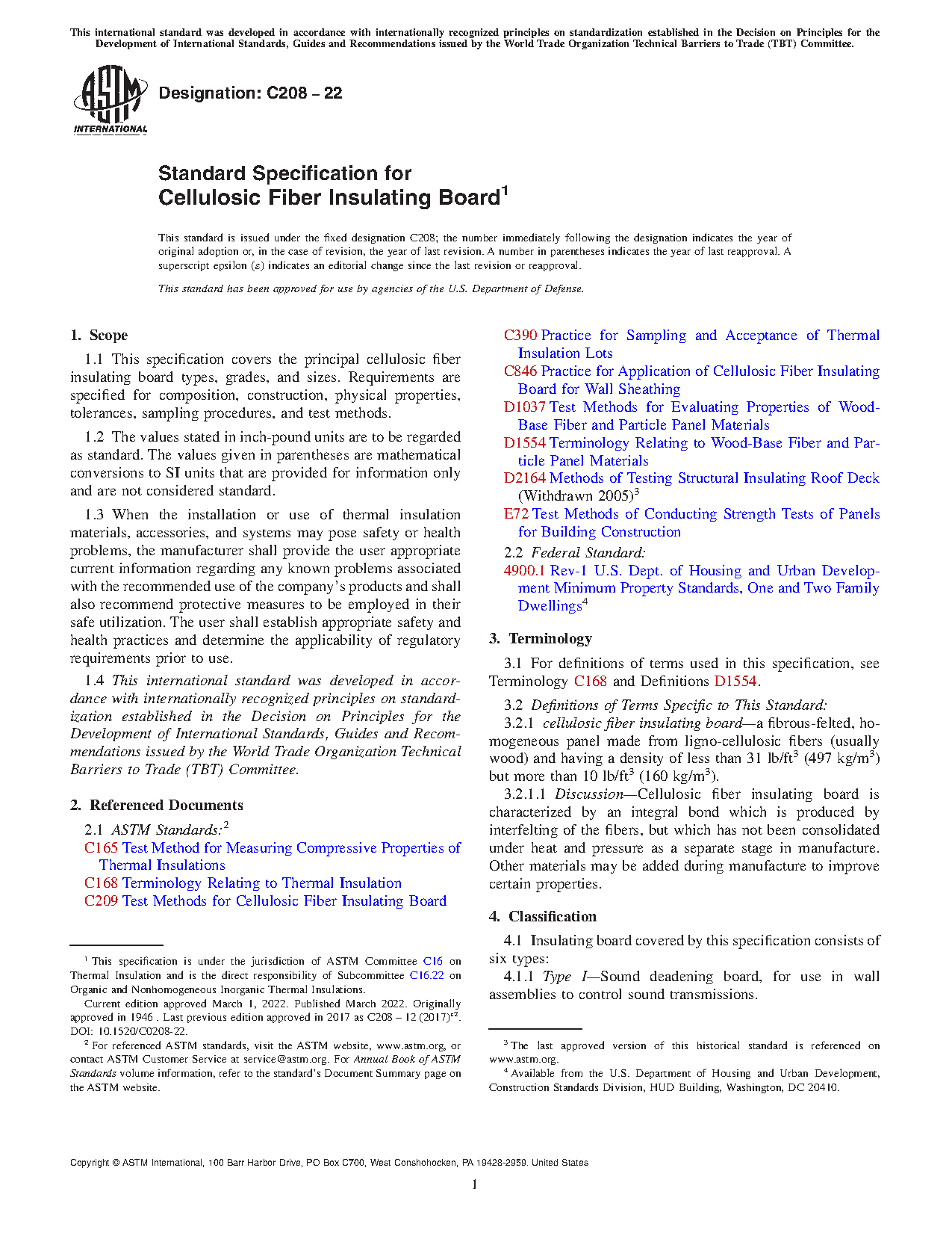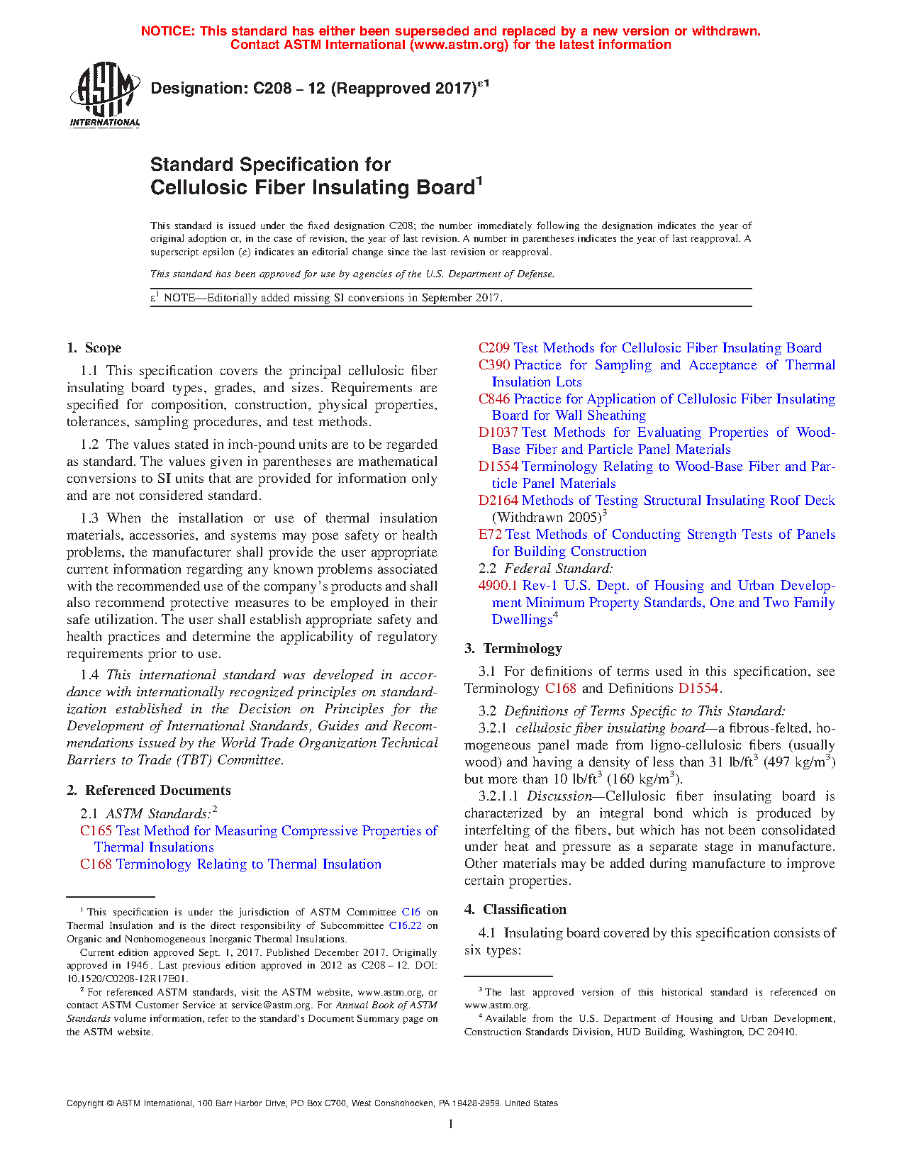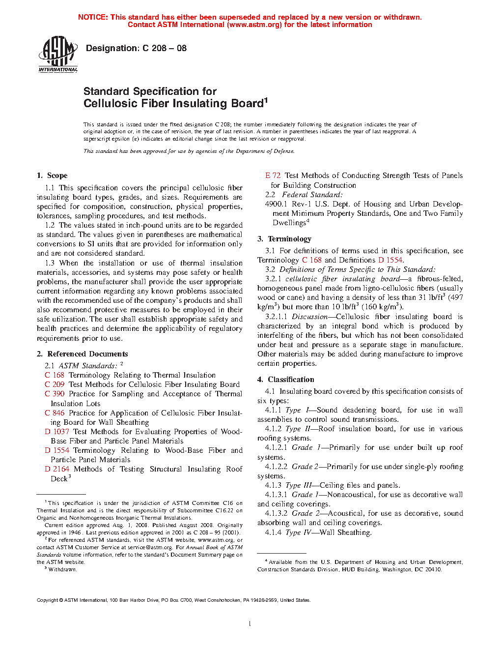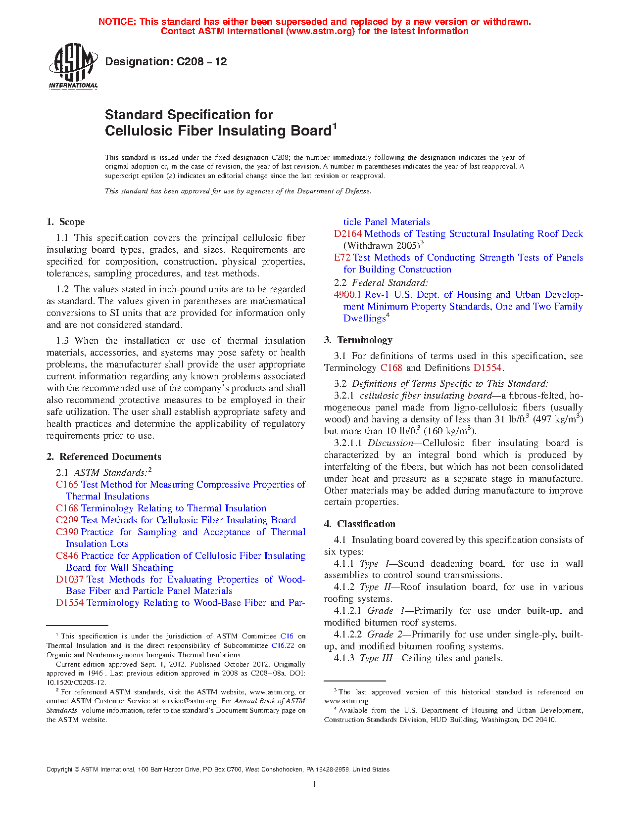 1.1 This specification covers the principal cellulosic fiber insulating board types, grades, and sizes. Requirements are specified for composition, construction, physical properties, tolerances, sampling procedures, and test methods.