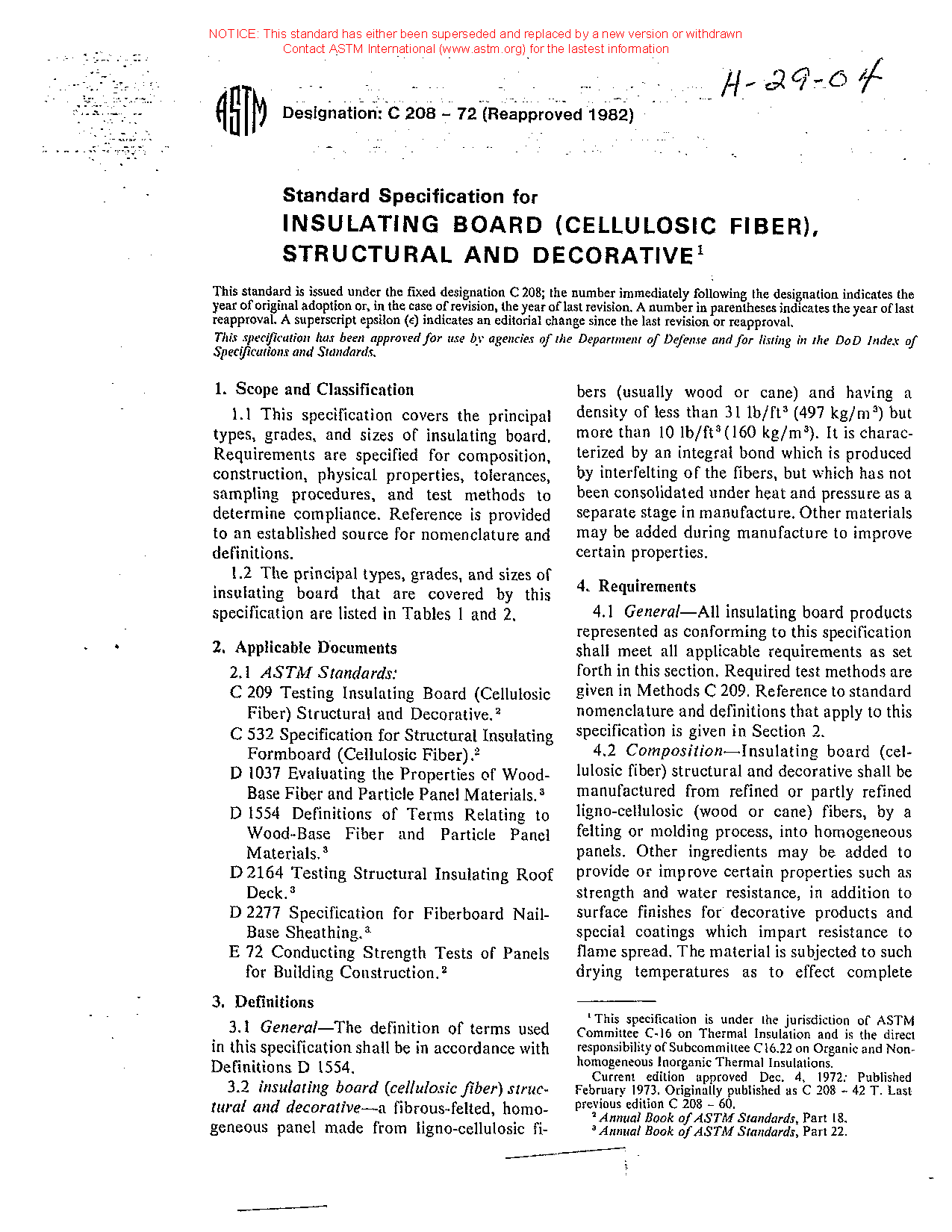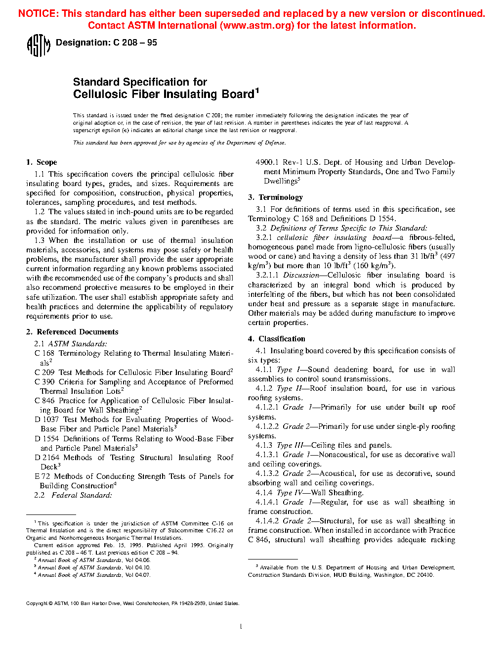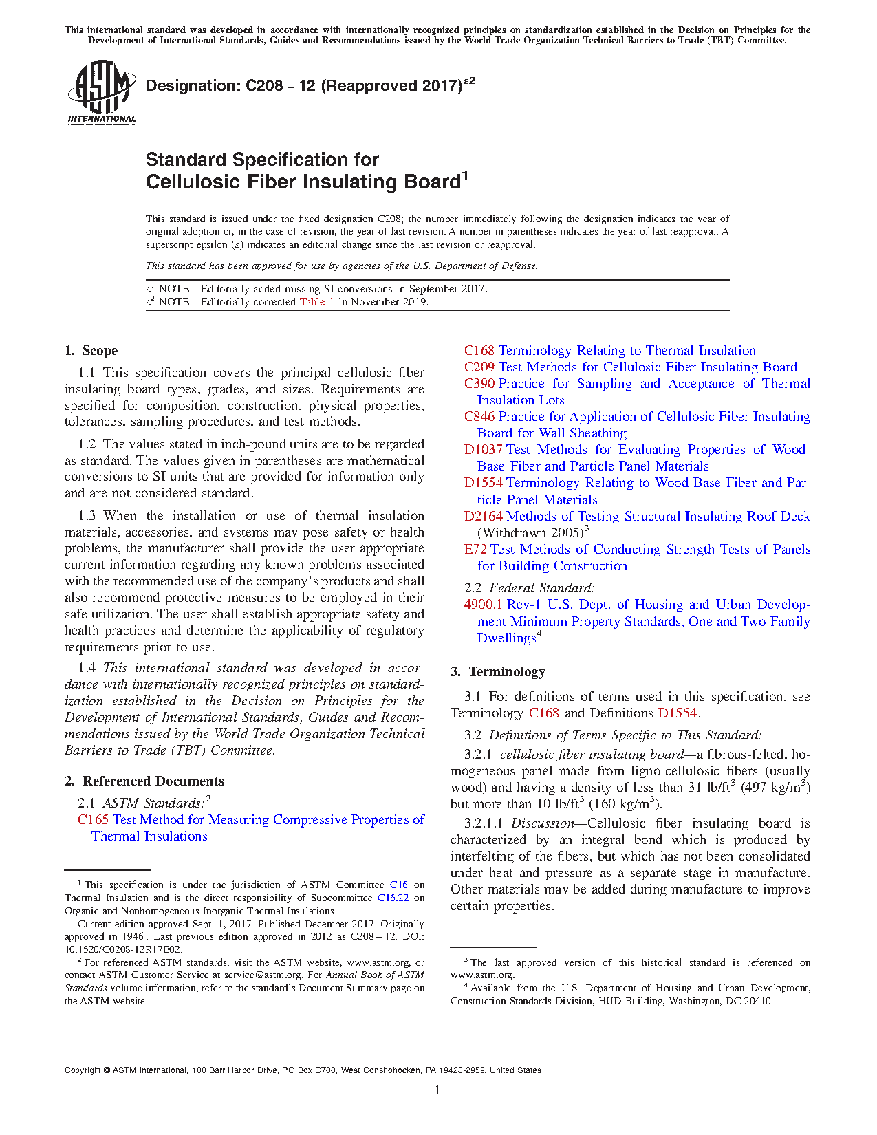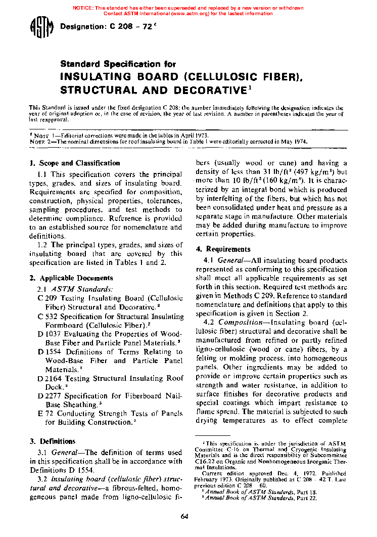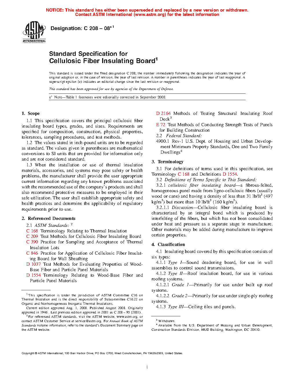 1.1 This specification covers the principal cellulosic fiber insulating board types, grades, and sizes. Requirements are specified for composition, construction, physical properties, tolerances, sampling procedures, and test methods.