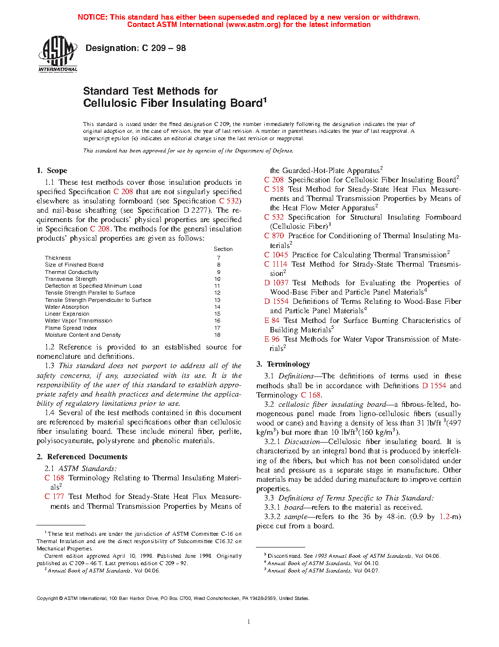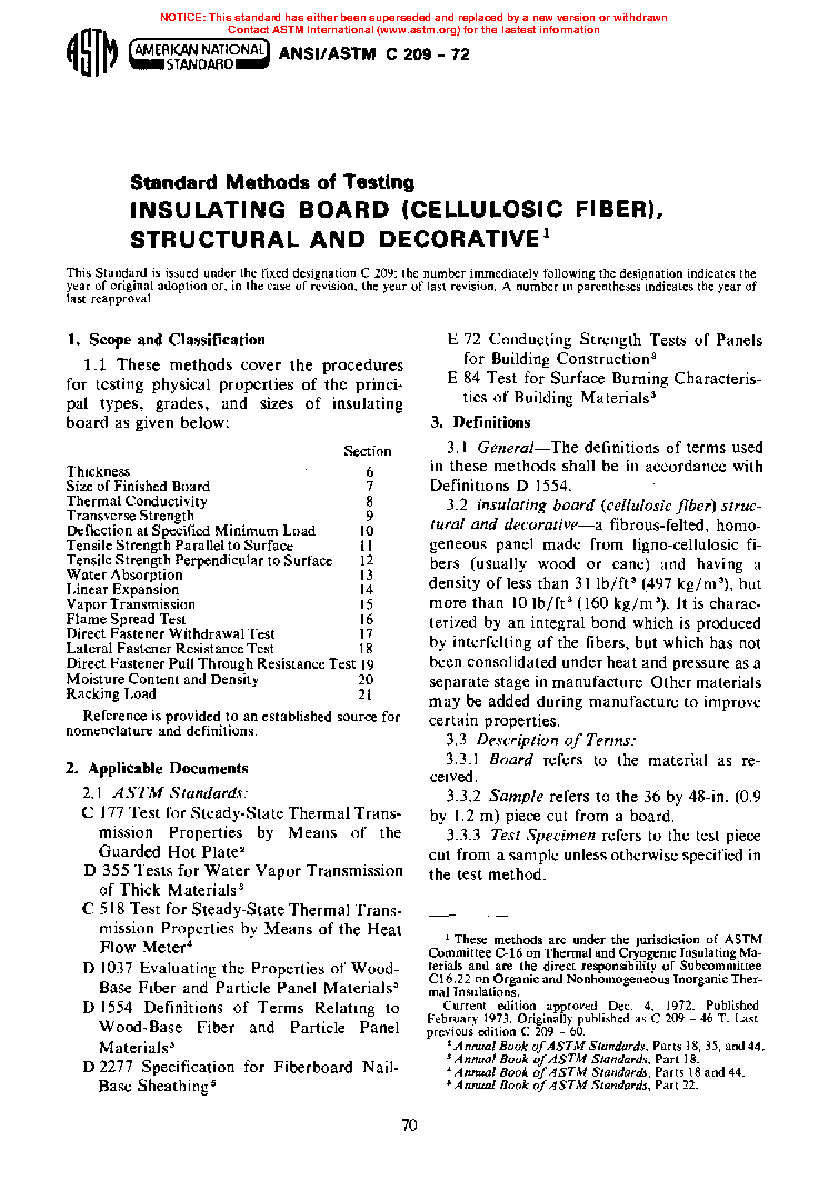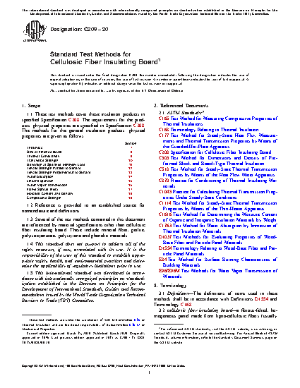 4.1 The test methods contained in this document are intended for cellulosic fiber insulating board as described in Specification C208. These test methods examine mechanical, physical and thermal properties, properties related to water absorption and water vapor exposure, and flammability related properties.