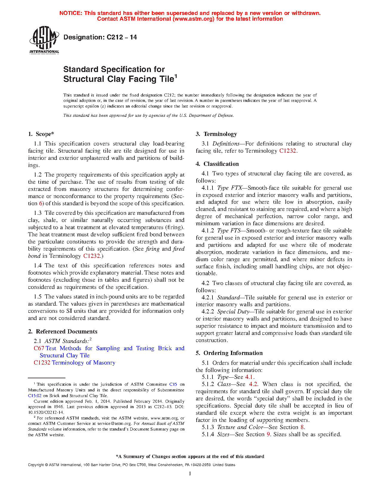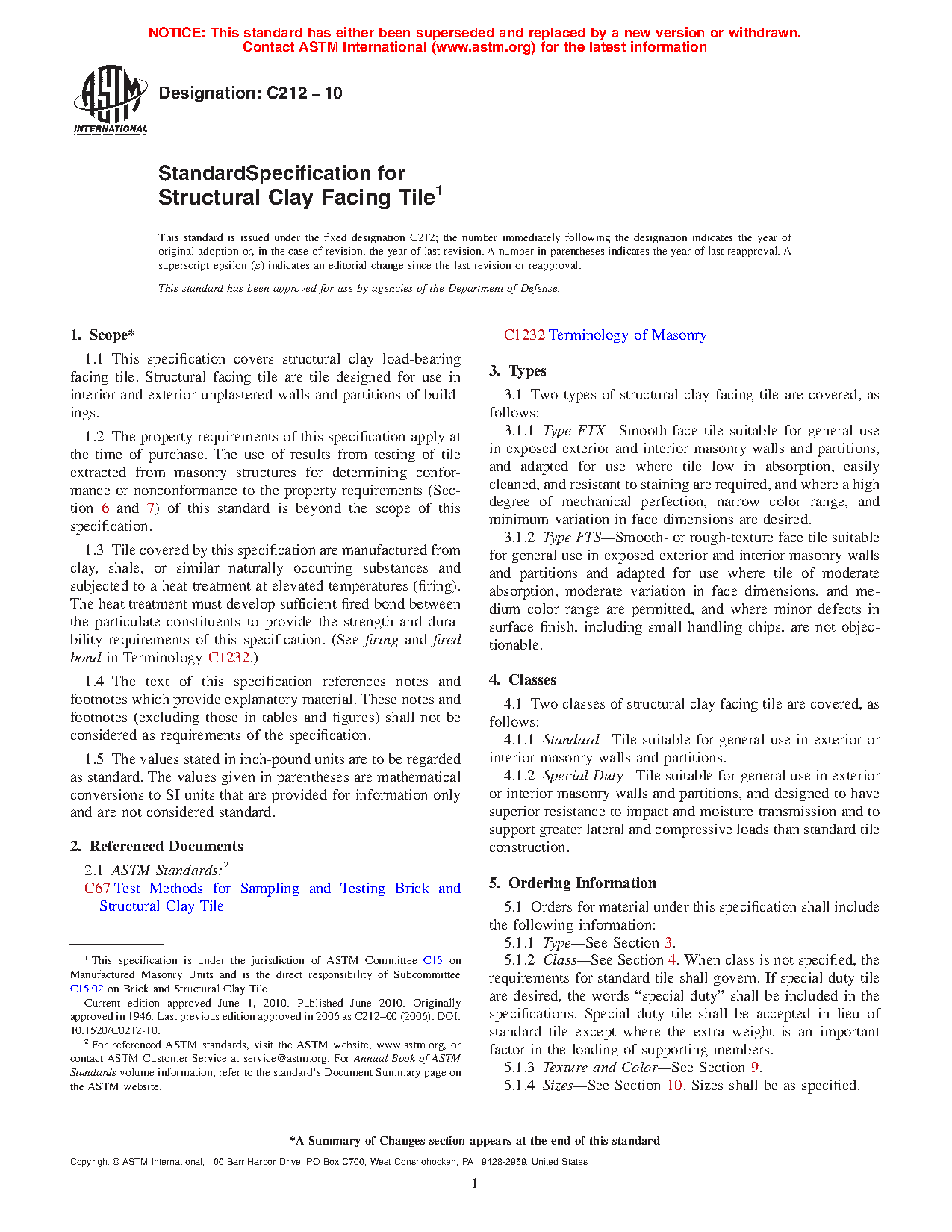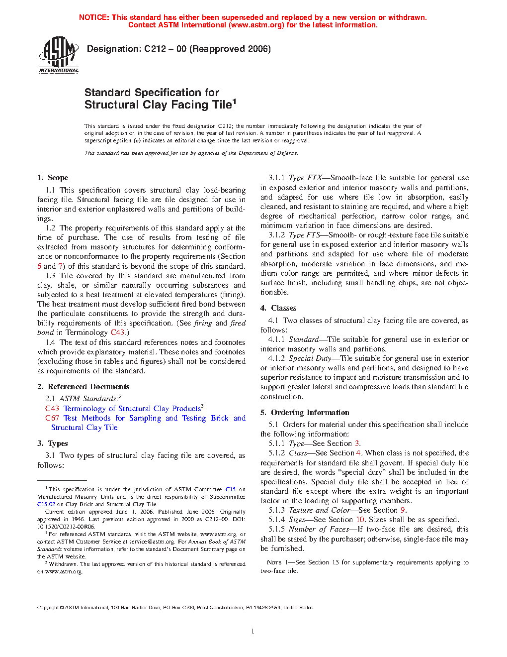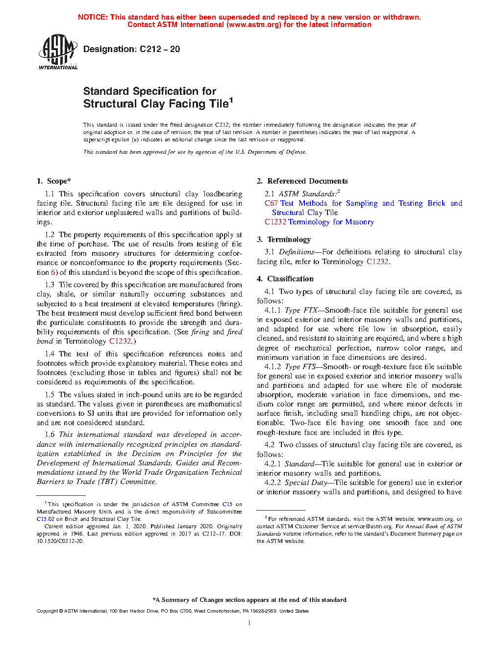 1.2 The property requirements of this specification apply at the time of purchase. The use of results from testing of tile extracted from masonry structures for determining conformance or nonconformance to the property requirements (Section 6) of this standard is beyond the scope of this specification.