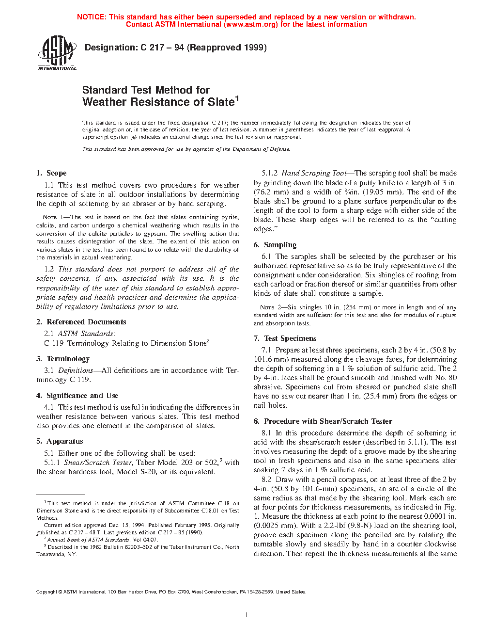 1.1 This test method covers two procedures for weather resistance of slate in all outdoor installations by determining the depth of softening by an abraser or by hand scraping.