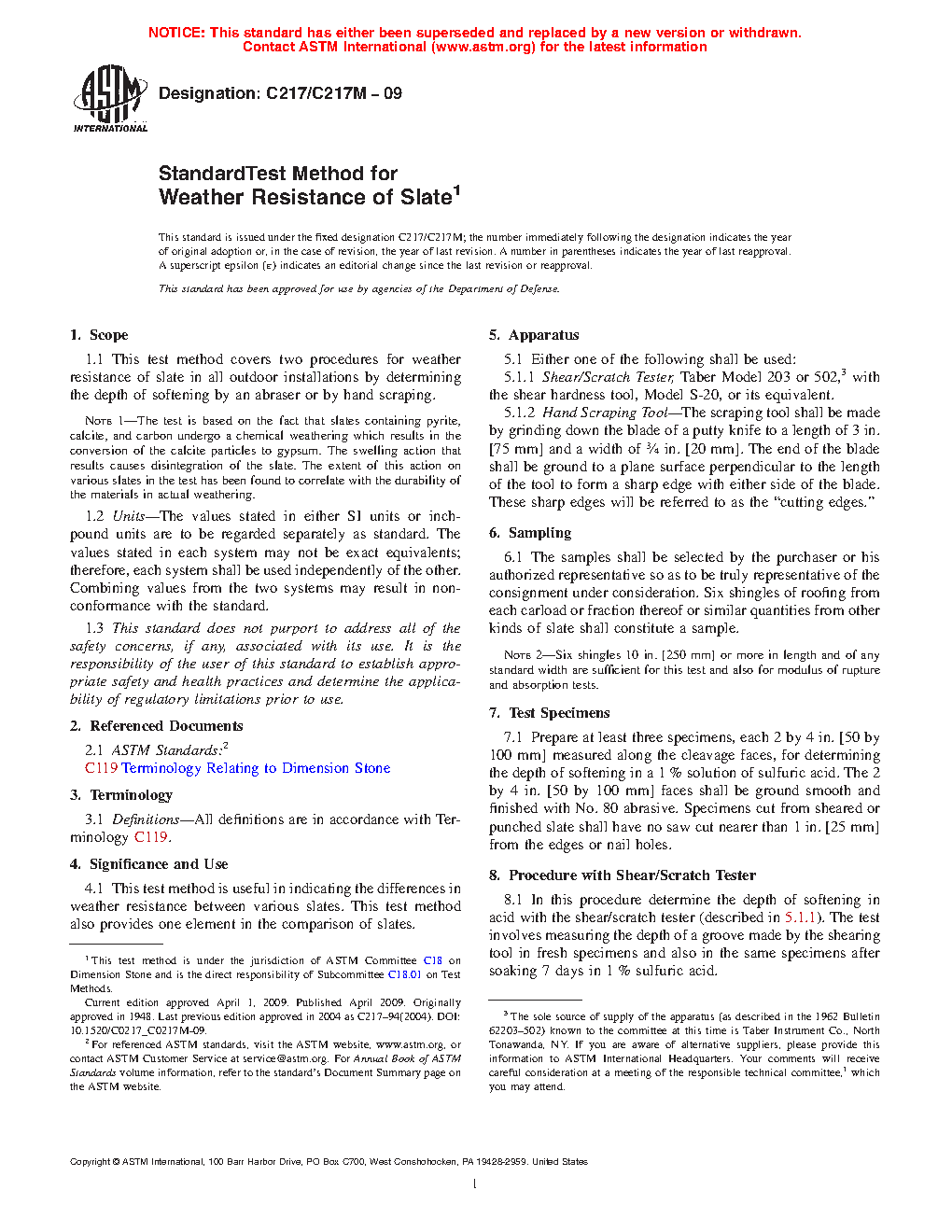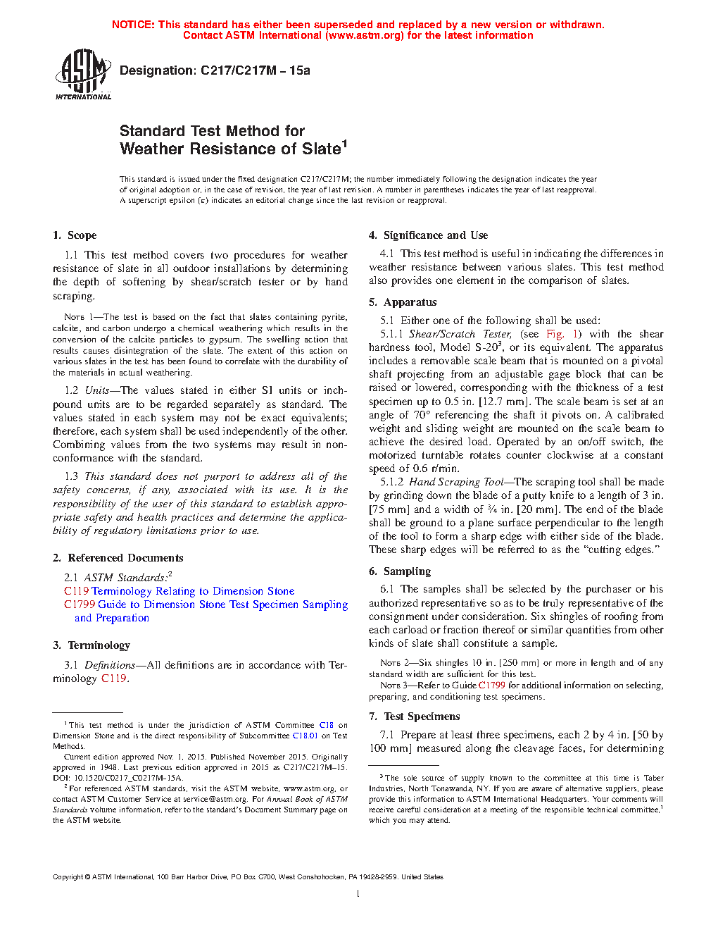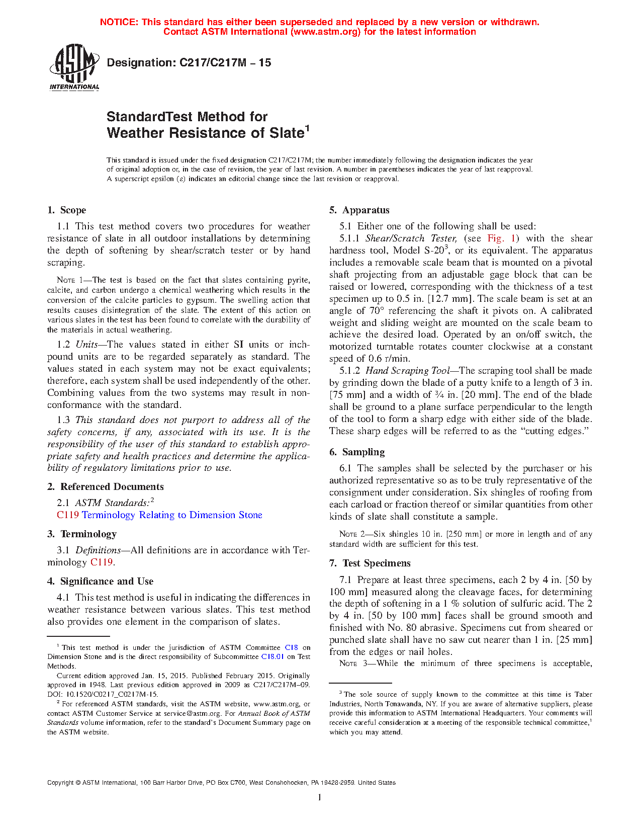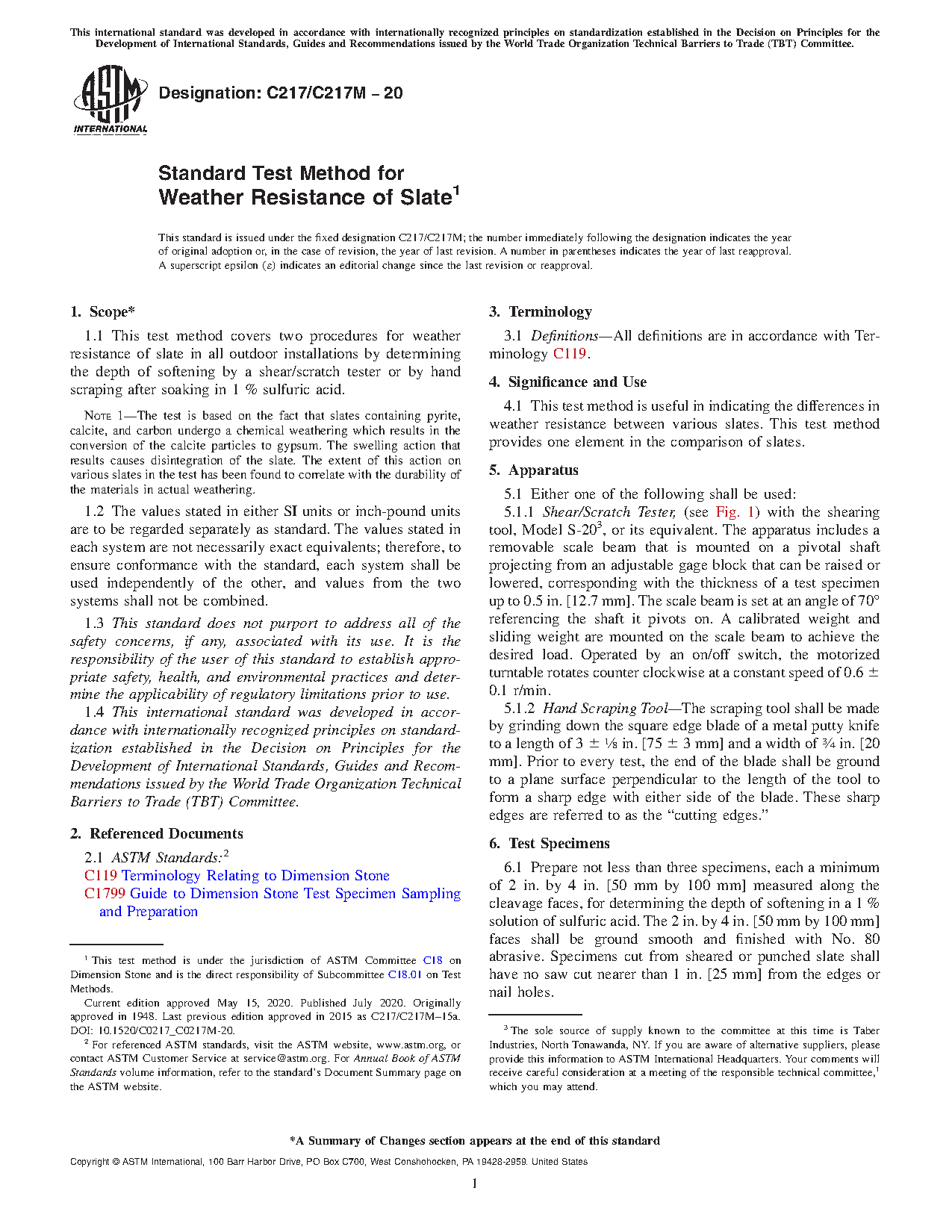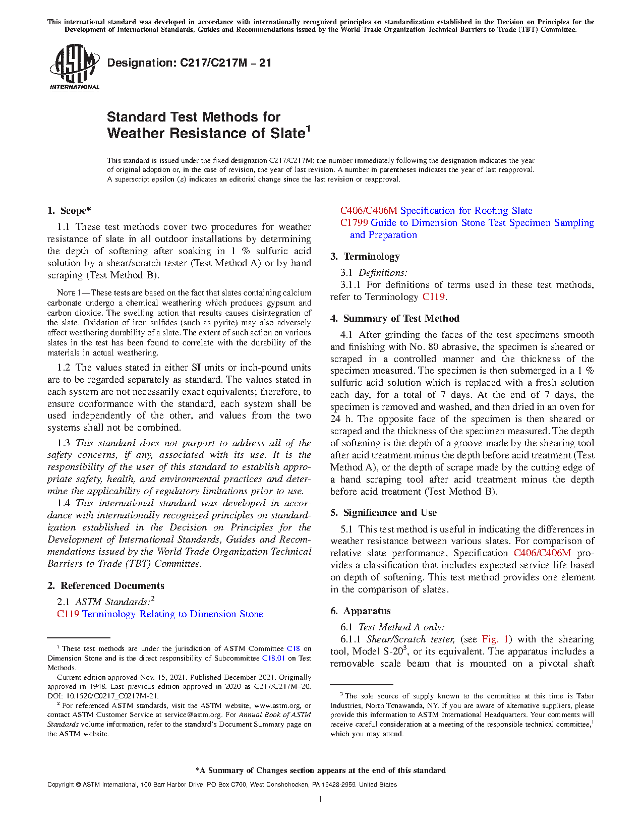 1.1 This test method covers two procedures for weather resistance of slate in all outdoor installations by determining the depth of softening by shear/scratch tester or by hand scraping.