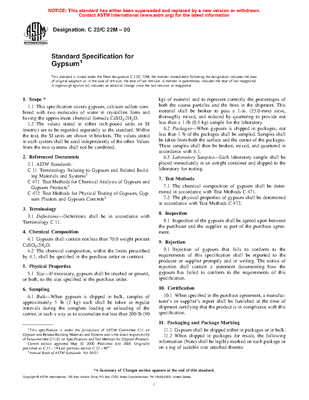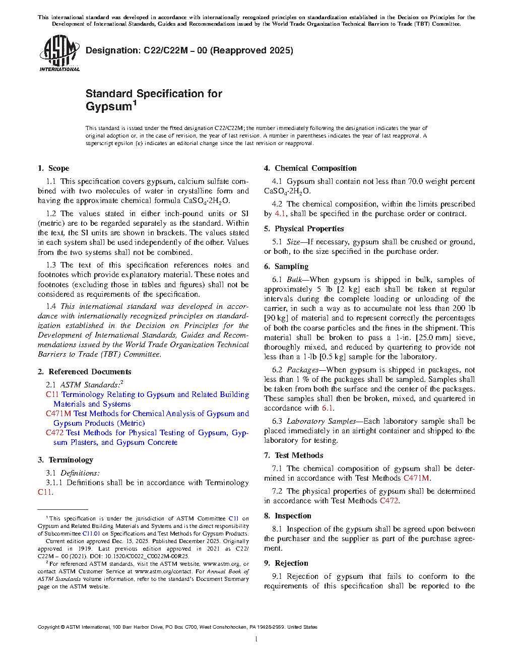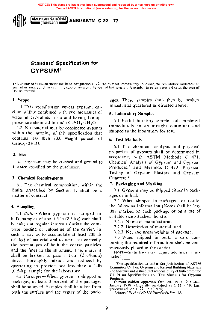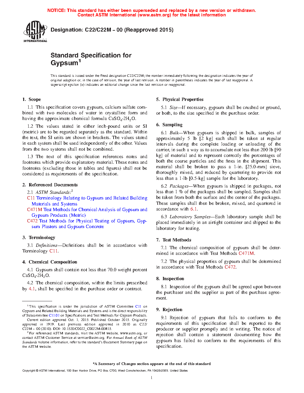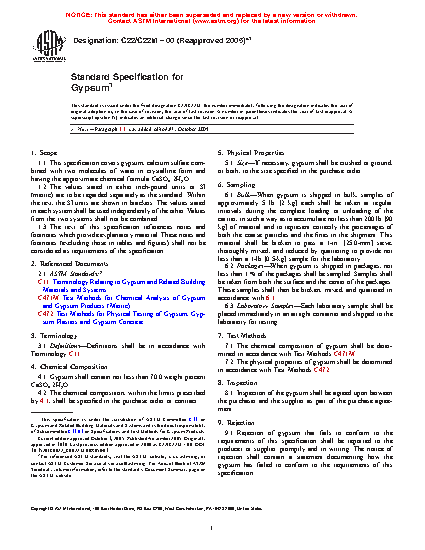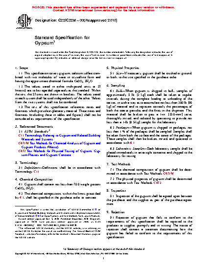 1.1 This specification covers gypsum, calcium sulfate combined with two molecules of water in crystalline form and having the approximate chemical formula CaSO4 [dot]2H2 O.