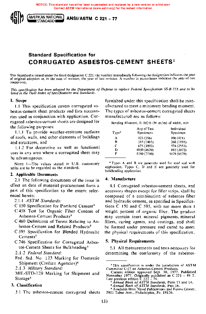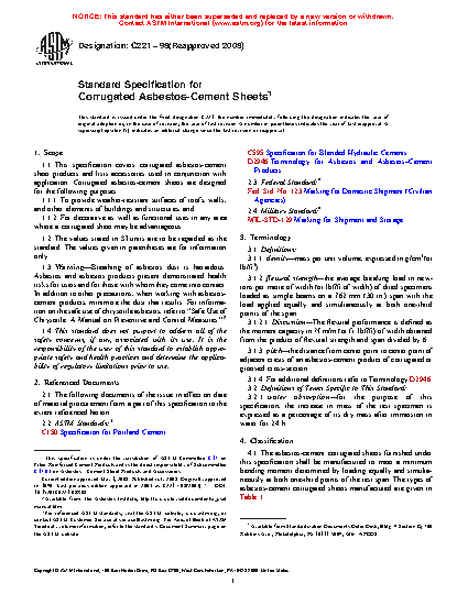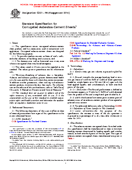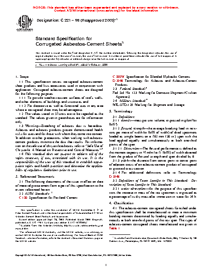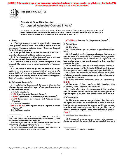 1.1 This specification covers corrugated asbestos-cement sheet products and lists accessories used in conjunction with application. Corrugated asbestos-cement sheets are designed for the following purposes: