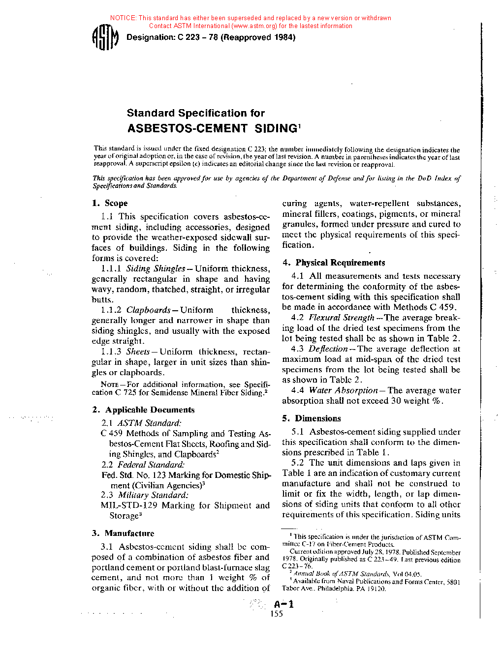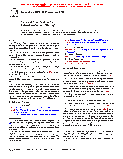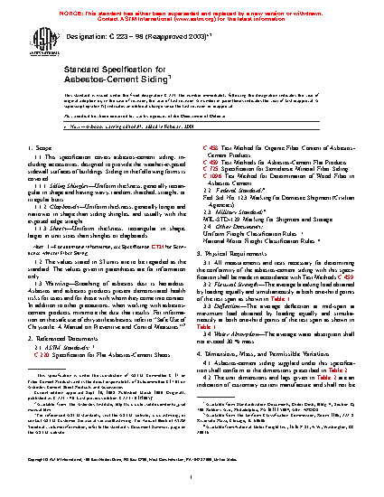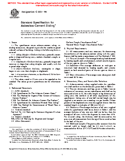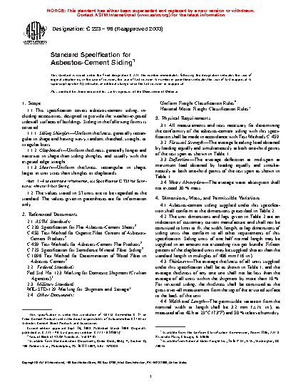 1.1 This specification covers asbestos-cement siding, including accessories, designed to provide the weather-exposed sidewall surfaces of buildings. Siding in the following forms is covered: