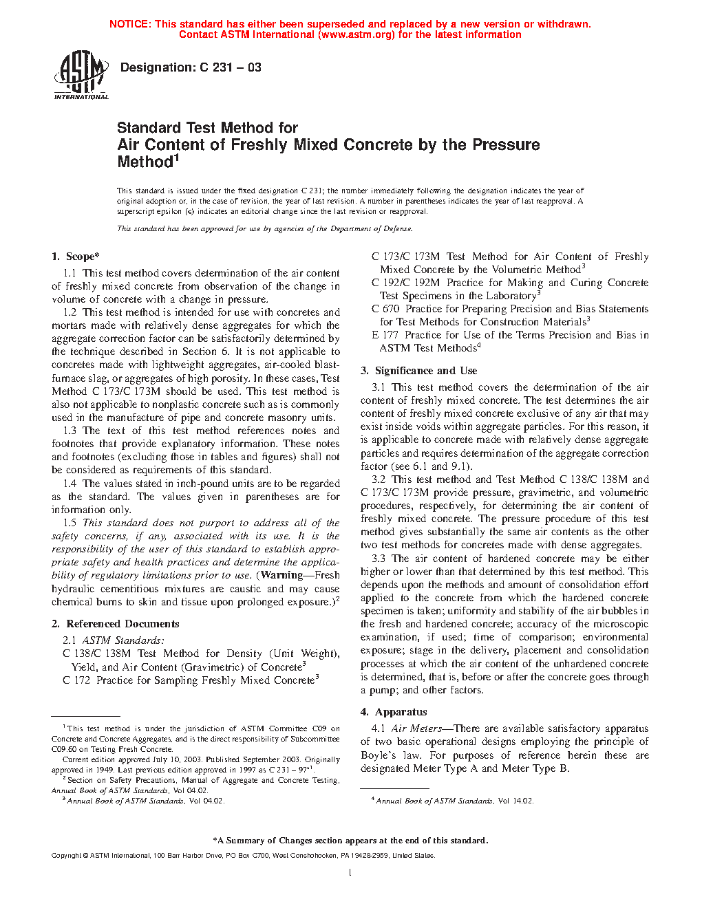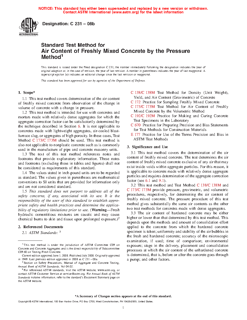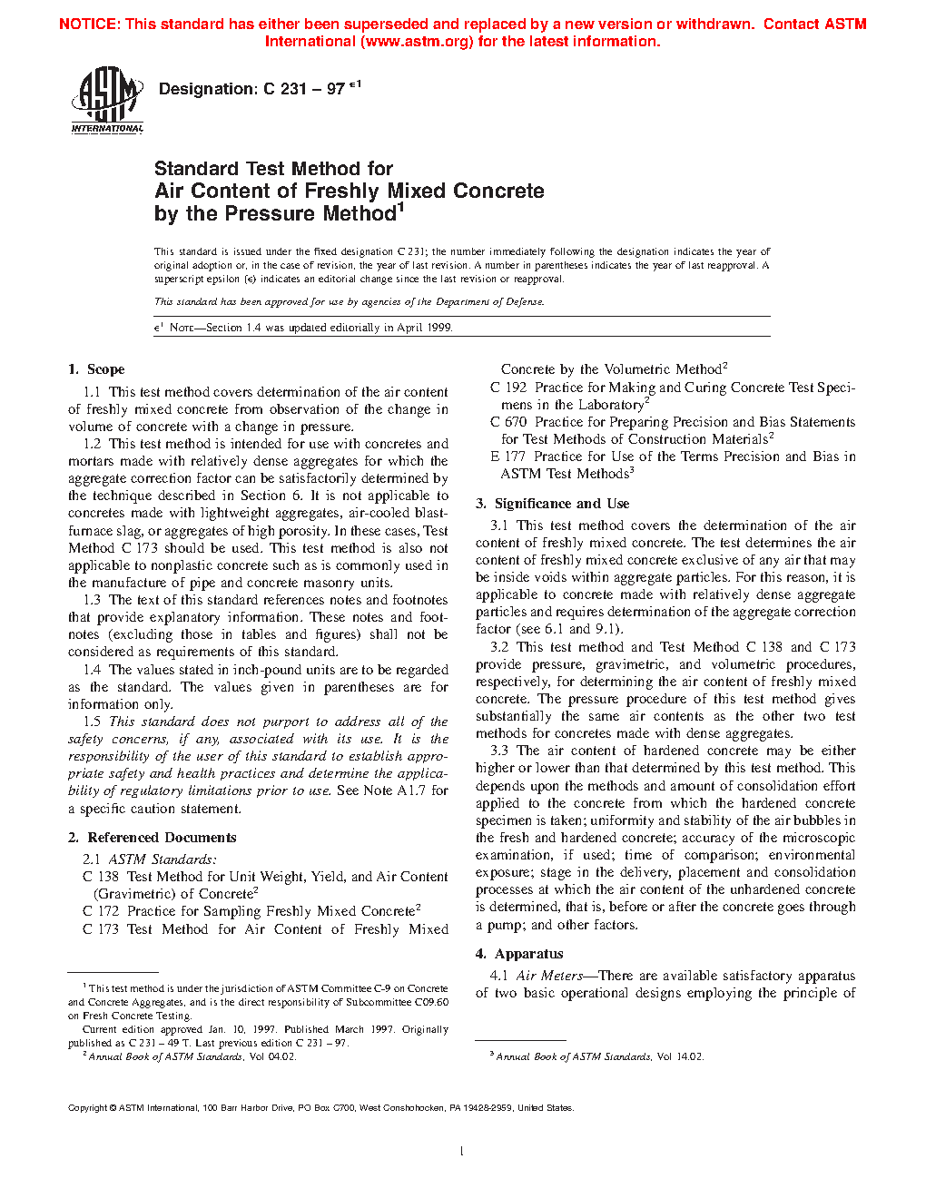 This test method covers the determination of the air content of freshly mixed concrete. The test determines the air content of freshly mixed concrete exclusive of any air that may exist inside voids within aggregate particles. For this reason, it is applicable to concrete made with relatively dense aggregate particles and requires determination of the aggregate correction factor (see 6.1 and 10.1).