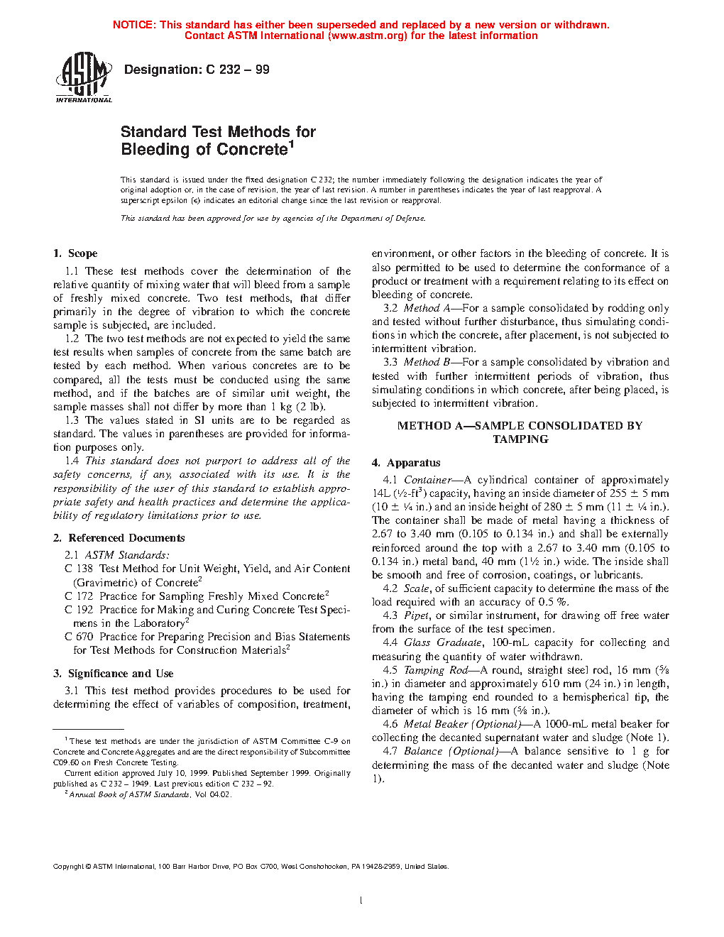 1.1 These test methods cover the determination of the relative quantity of mixing water that will bleed from a sample of freshly mixed concrete. Two test methods, that differ primarily in the degree of vibration to which the concrete sample is subjected, are included.