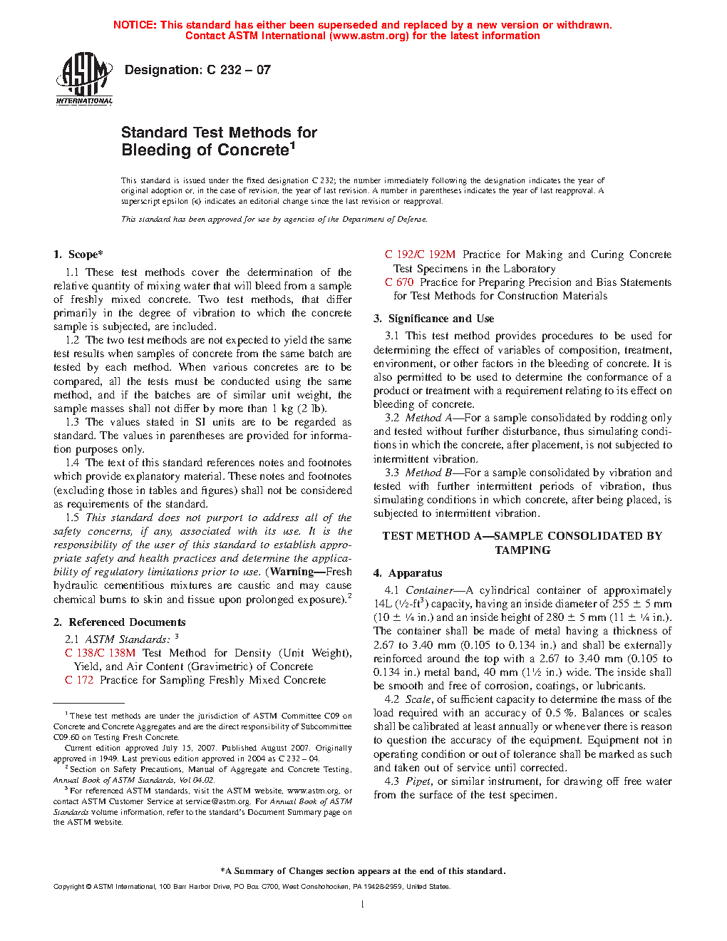 1.1 These test methods cover the determination of the relative quantity of mixing water that will bleed from a sample of freshly mixed concrete. Two test methods, that differ primarily in the degree of vibration to which the concrete sample is subjected, are included.
