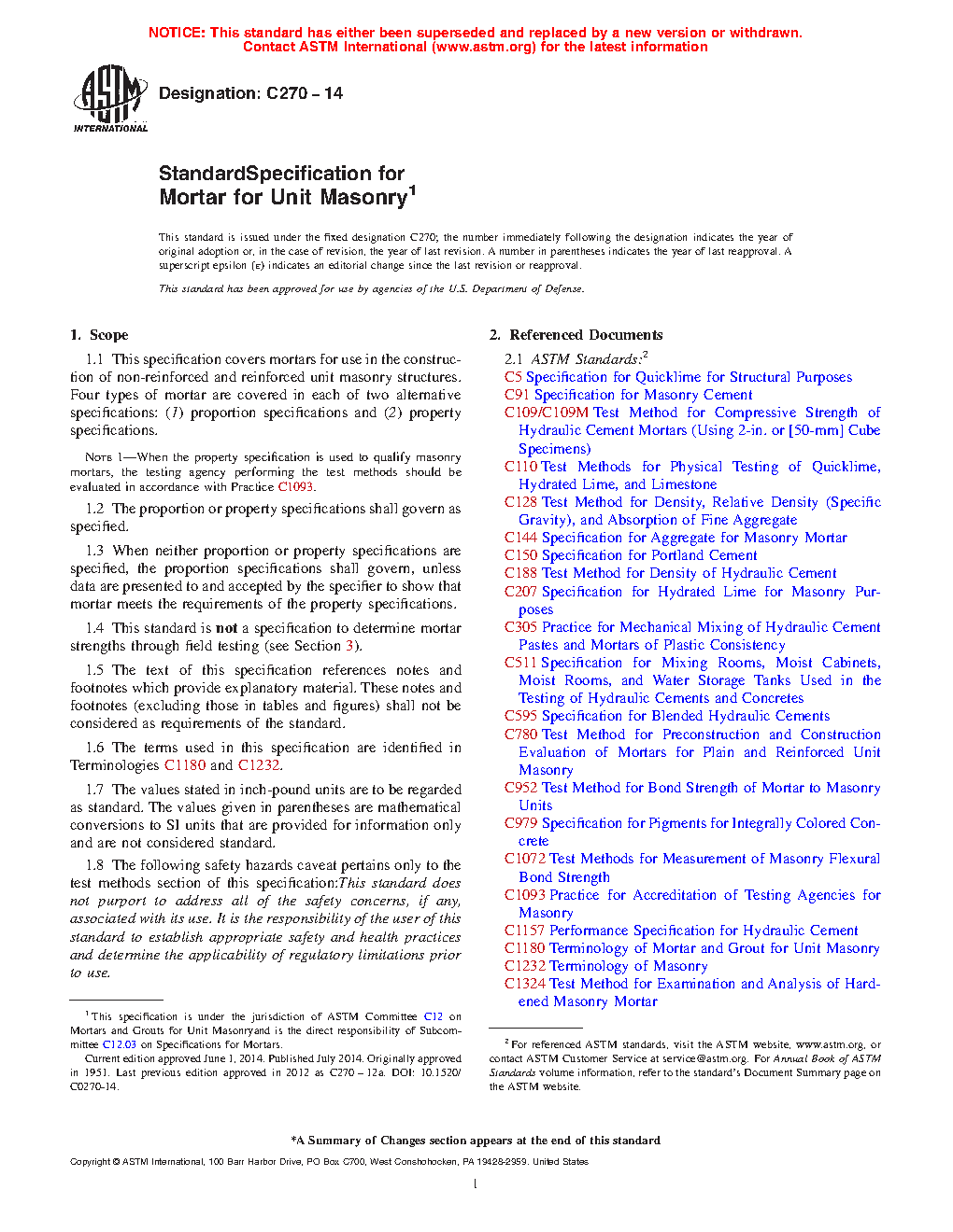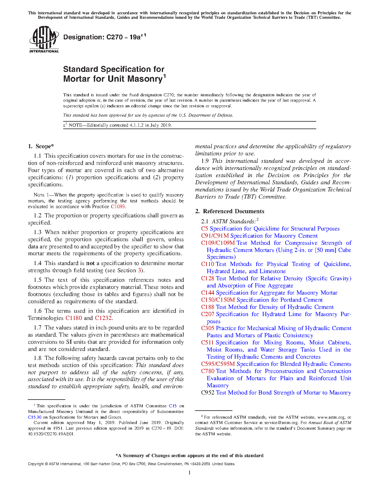 This specification covers mortars for use in the construction of non-reinforced and reinforced unit masonry structures. Four types of mortar are covered in each of two alternative specifications: (1) proportion specifications and (2) property specifications. The property specification applies to mortar mixed to a specific flow in the laboratory. When neither proportion nor property specifications are specified, the proportion specifications shall govern, unless data are presented to and accepted by the specifier to show that mortar meets the requirements of the property specifications. This specification does not cover the determination of mortar strengths through field testing. The compressive strength values resulting from field tested mortars do not represent the compressive strength of mortar tested in the laboratory nor that of the mortar in the wall. Physical properties of field sampled mortar shall not be used to determine compliance to this specification and are not intended as criteria to determine the acceptance of rejection of the mortar. Compliance to this specification is verified by confirming that the materials used are as specified, meet the requirements as given, and added to the mixer in the proper proportions as described.
