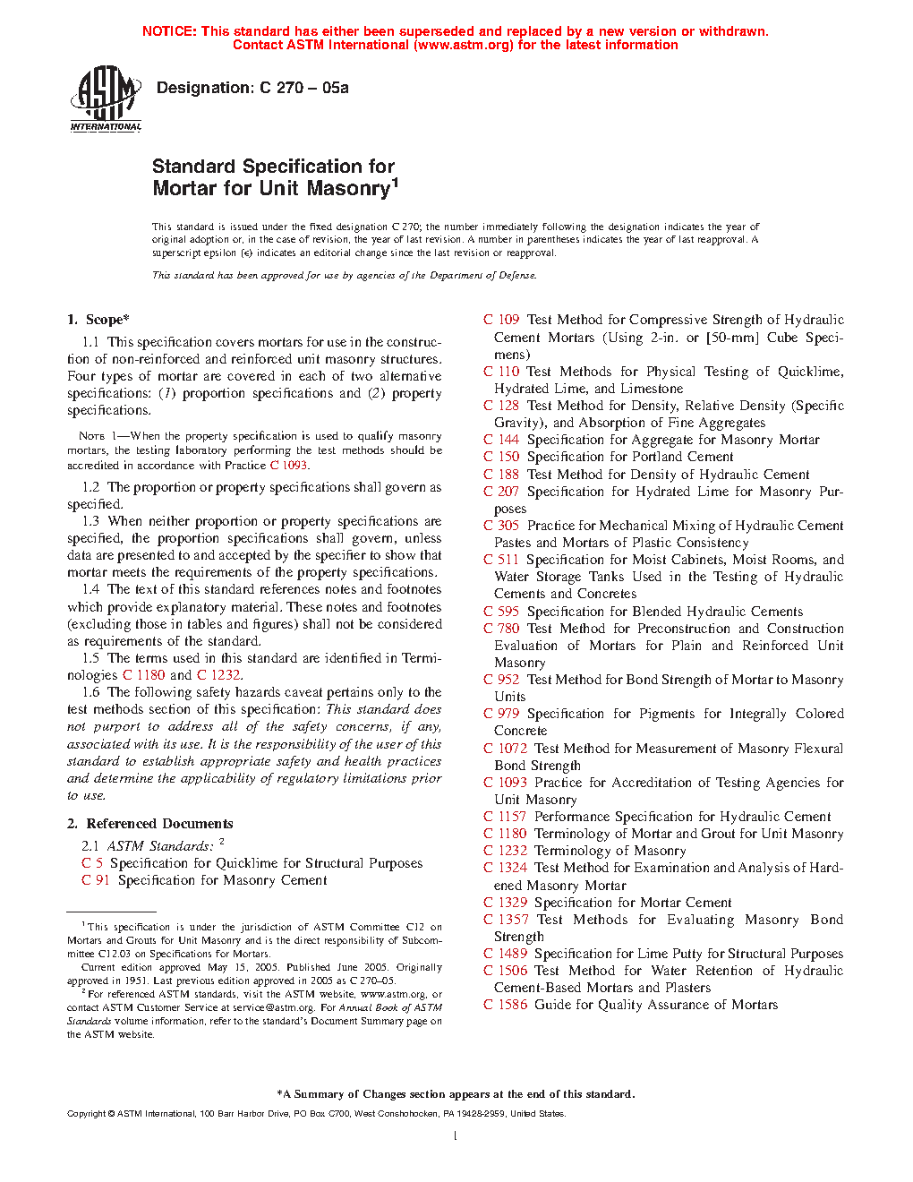 1.1 This specification covers mortars for use in the construction of non-reinforced and reinforced unit masonry structures. Four types of mortar are covered in each of two alternative specifications: (1) proportion specifications and (2) property specifications.