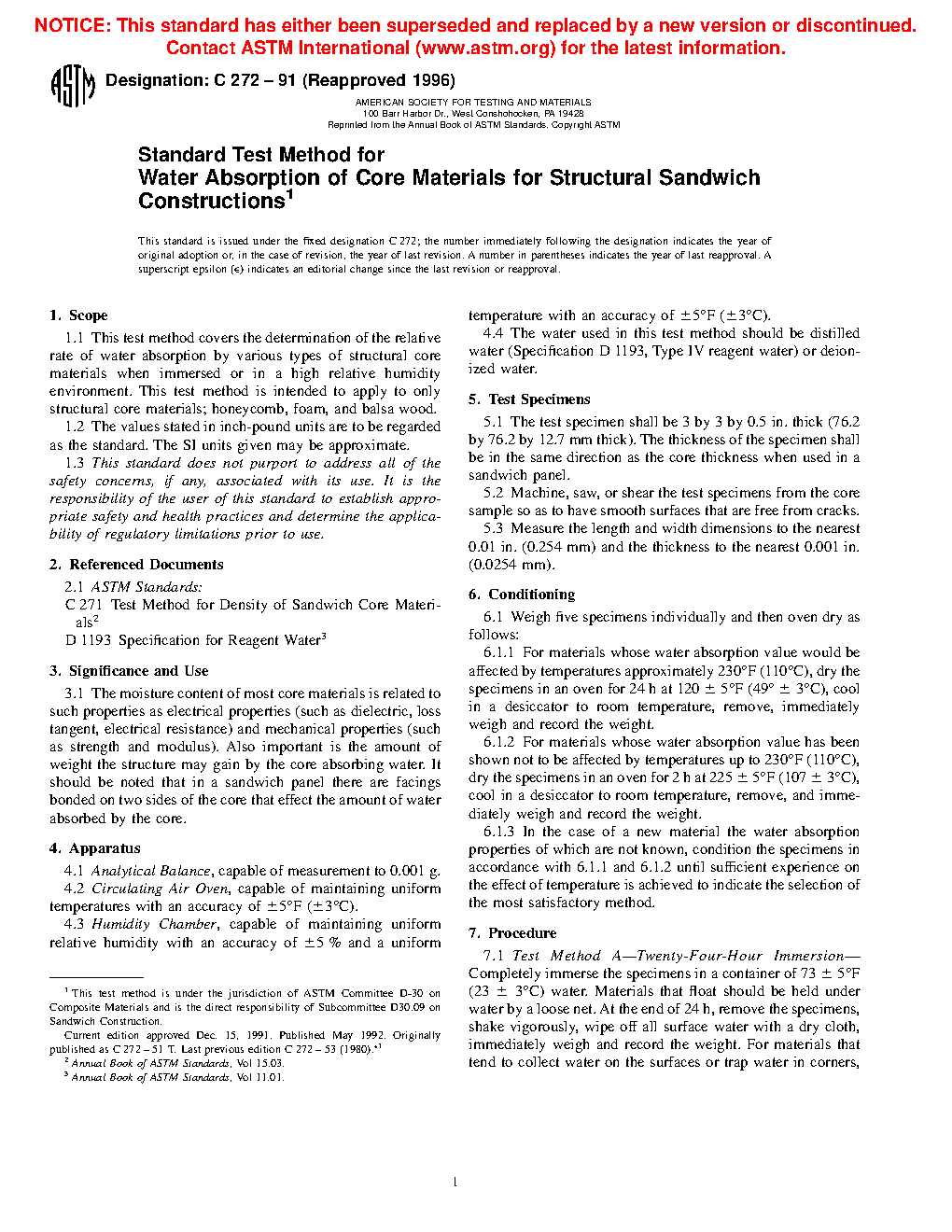 1.1 This test method covers the determination of the relative amount of water absorption by various types of structural core materials when immersed or in a high relative humidity environment. This test method is intended to apply to only structural core materials; honeycomb, foam, and balsa wood.