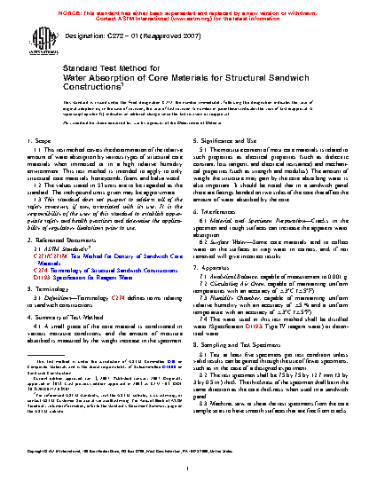 1.1 This test method covers the determination of the relative amount of water absorption by various types of structural core materials when immersed or in a high relative humidity environment. This test method is intended to apply to only structural core materials; honeycomb, foam, and balsa wood.