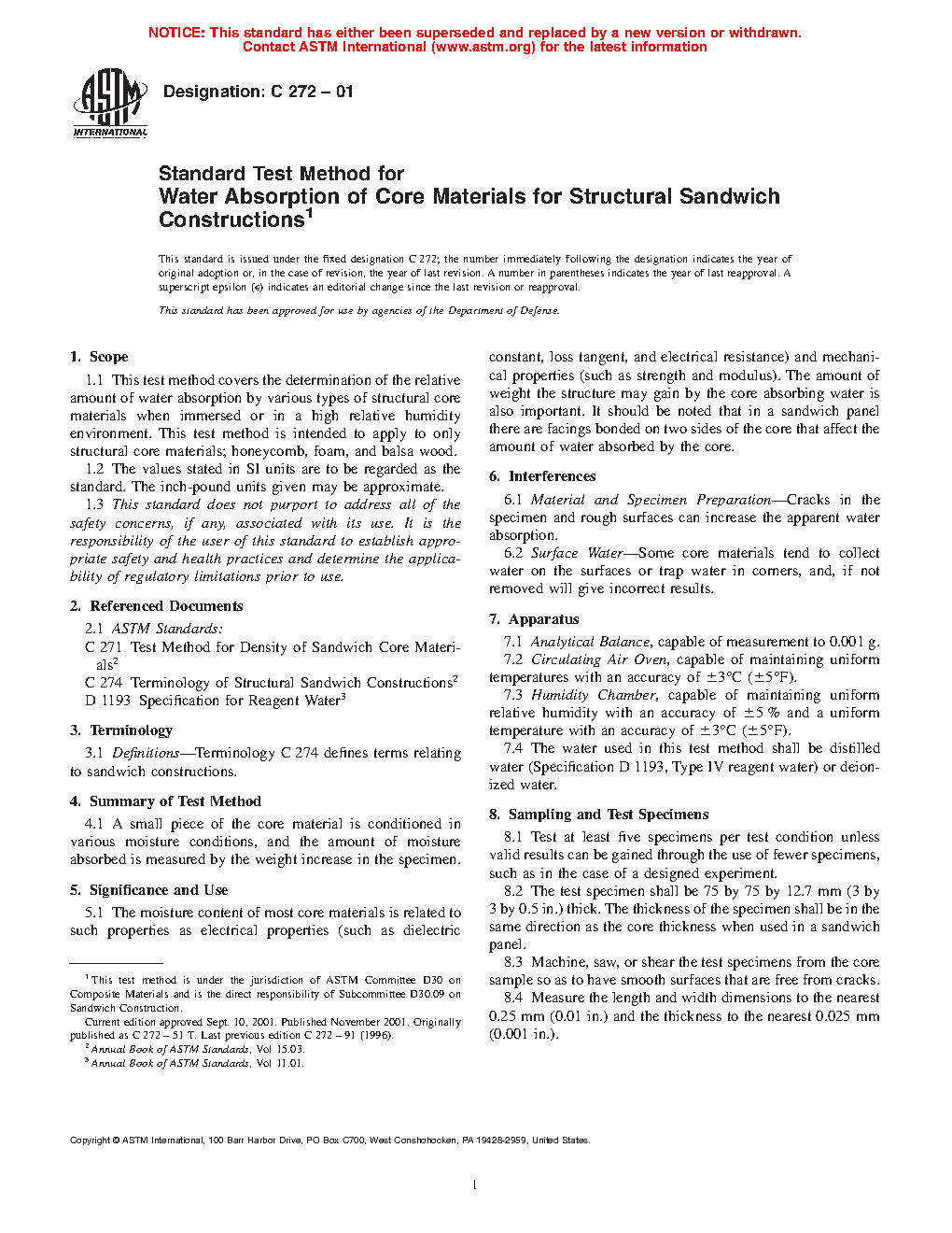 Standard Test Method for Water Absorption of Core Materials for Structural Sandwich Constructions