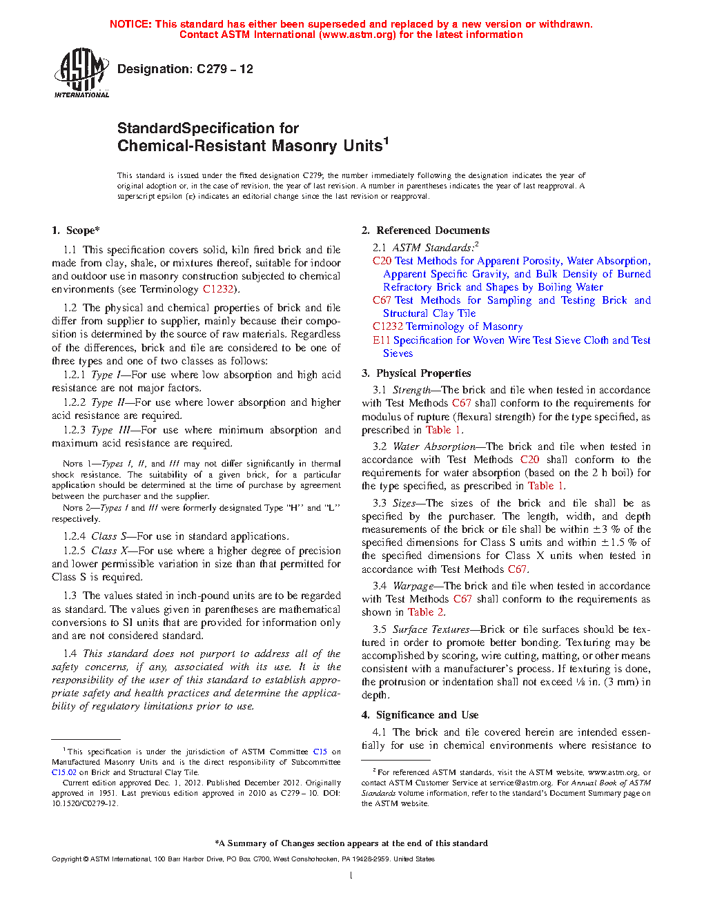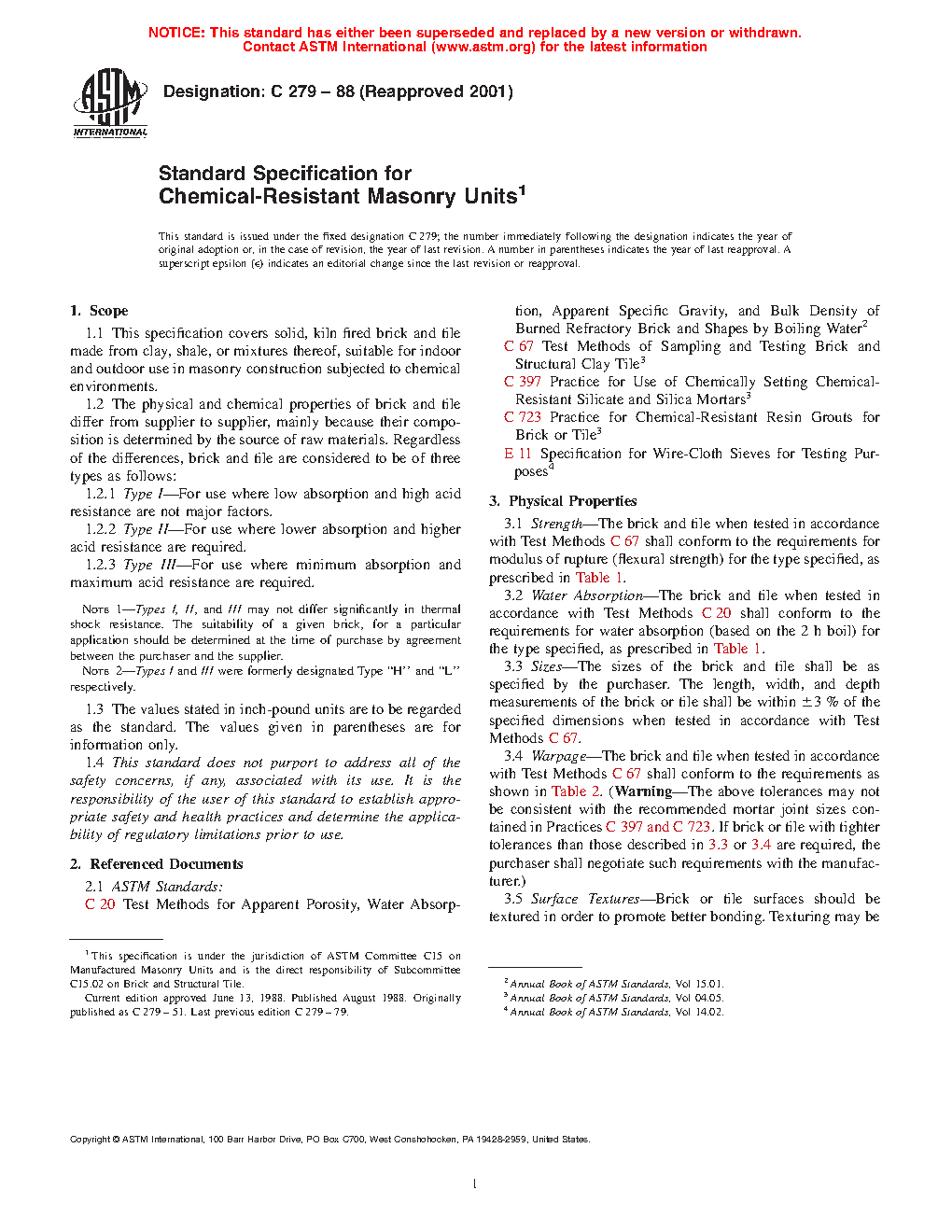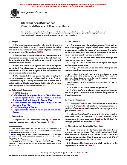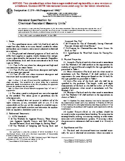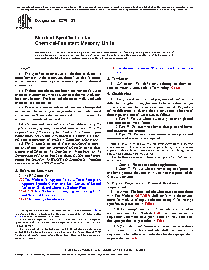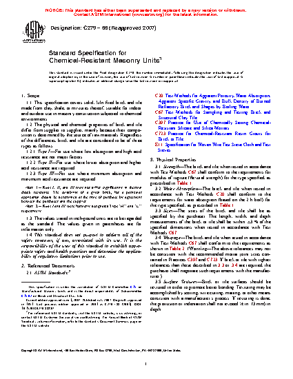 This specification covers chemical-resistant masonry units, specifically, solid kiln fired bricks and tiles made from clay, shale, or mixtures thereof, suitable for indoor and outdoor use in masonry construction subjected to chemical environments. The bricks and tiles are considered to be of three types as follows: Type I, for use where low absorption and high acid resistance are not major factors; Type II, for use where lower absorption and higher acid resistance are required; and Type III, for use where minimum absorption and maximum acid resistance are required. The masonry units shall undergo tests and adhere accordingly to the following physical and chemical requirements: water absorption, warpage, surface texture, size and dimension, flexural strength, modulus of rupture, sulfuric acid solubility, and percent weight loss.