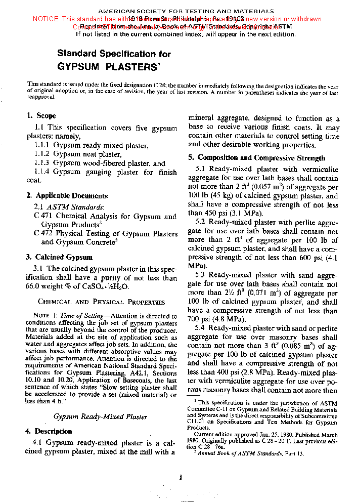1.1 This specification covers four gypsum plasters; gypsum mill-mixed plaster, gypsum neat plaster, gypsum wood fibered plaster and gypsum gauging plaster.