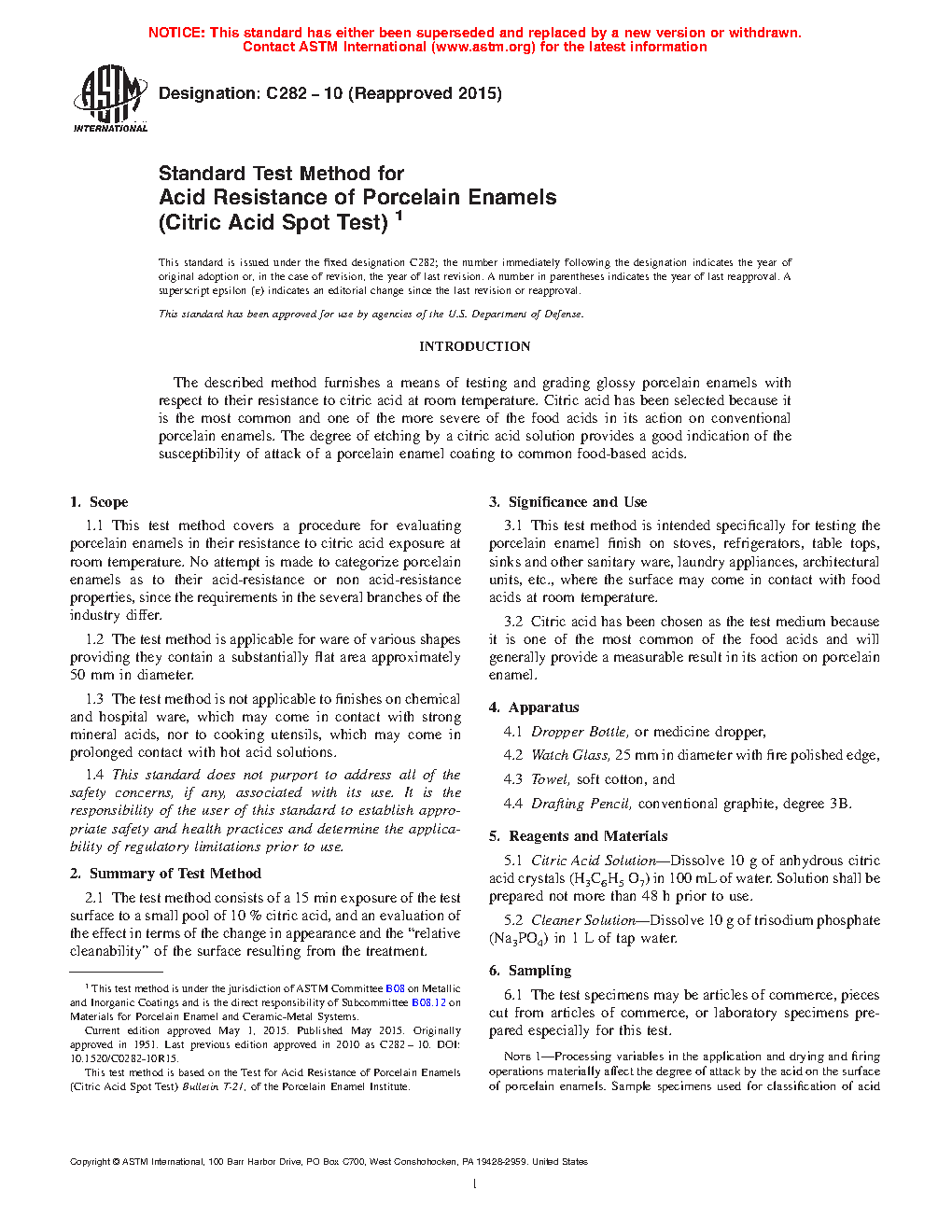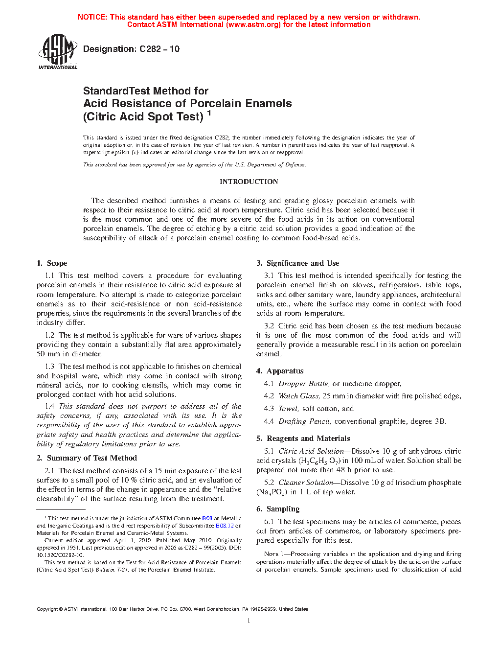 This test method is intended specifically for testing the porcelain enamel finish on stoves, refrigerators, table tops, sinks and other sanitary ware, laundry appliances, architectural units, etc., where the surface may come in contact with food acids at room temperature.