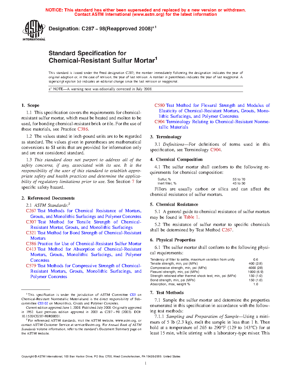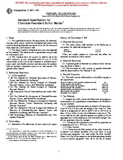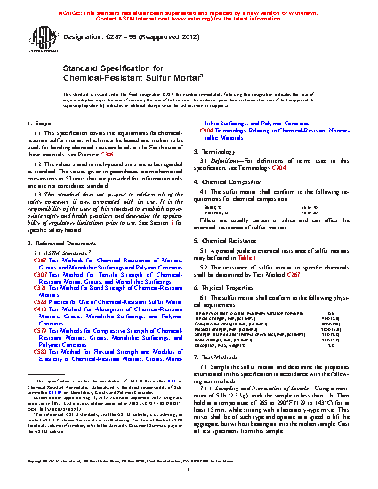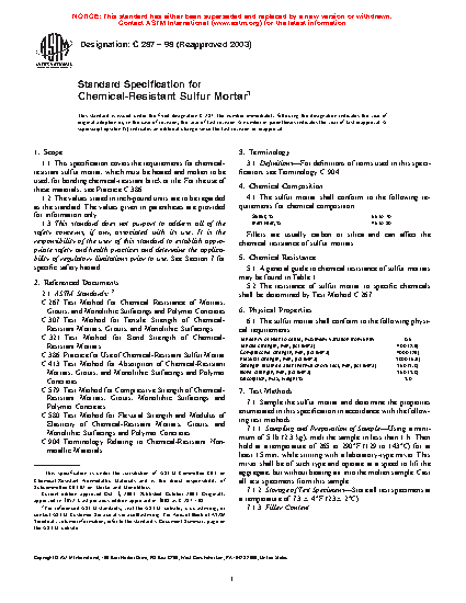 1.1 This specification covers the requirements for chemical-resistant sulfur mortar, which must be heated and molten to be used, for bonding chemical-resistant brick or tile. For the use of these materials, see Practice C386.