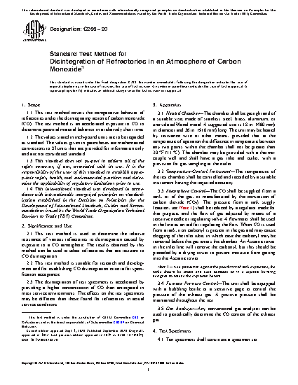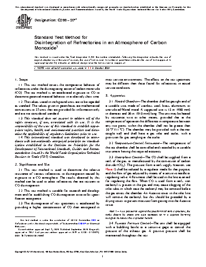 2.1 This test method is used to determine the relative resistance of various refractories to disintegration caused by exposure to a CO atmosphere. The results obtained by this method can be used to select refractories that are resistant to CO disintegration.