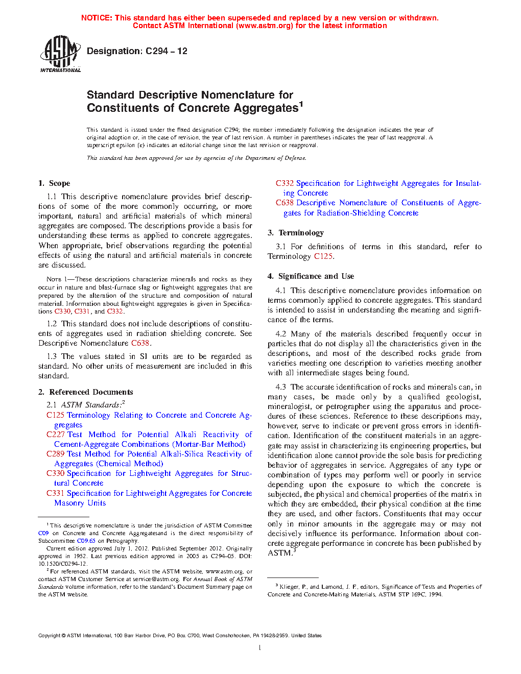 Note 1: These descriptions characterize minerals and rocks as they occur in nature and blast-furnace slag or lightweight aggregates that are prepared by the alteration of the structure and composition of natural material. Information about lightweight aggregates is given in Specifications C330, C331, and C332.