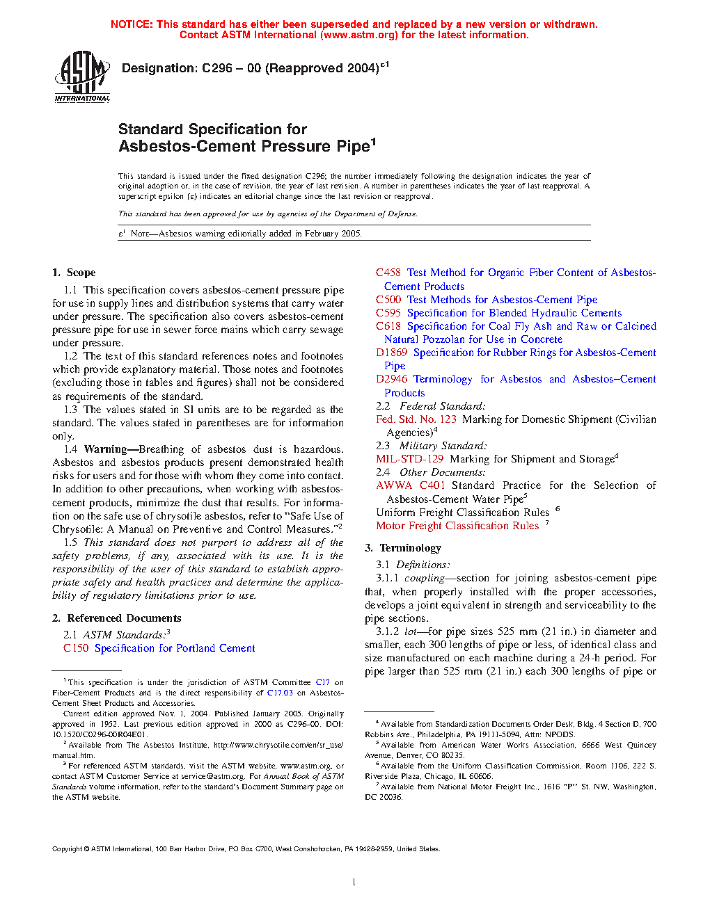 1.4 Breathing of asbestos dust is hazardous. Asbestos and asbestos products present demonstrated health risks for users and for those with whom they come into contact. In addition to other precautions, when working with asbestos-cement products, minimize the dust that results. For information on the safe use of chrysotile asbestos, refer to "Safe Use of Chrysotile: A Manual on Preventive and Control Measures."