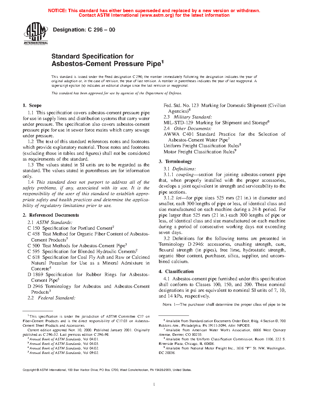 This specification covers asbestos-cement pressure pipe for use in supply lines and distribution systems that carry water under pressure. The specification also covers asbestos-cement pressure pipe for use in sewer force mains which carry sewage under pressure. Asbestos-cement pipe furnished shall conform to Classes 100, 150, and 200. The types of pipe shall be known as Type I and Type II corresponding to the chemical requirements. Hydrostatic strength; crushing strength; and flexural strength test shall be performed to conform to the specified requirements.