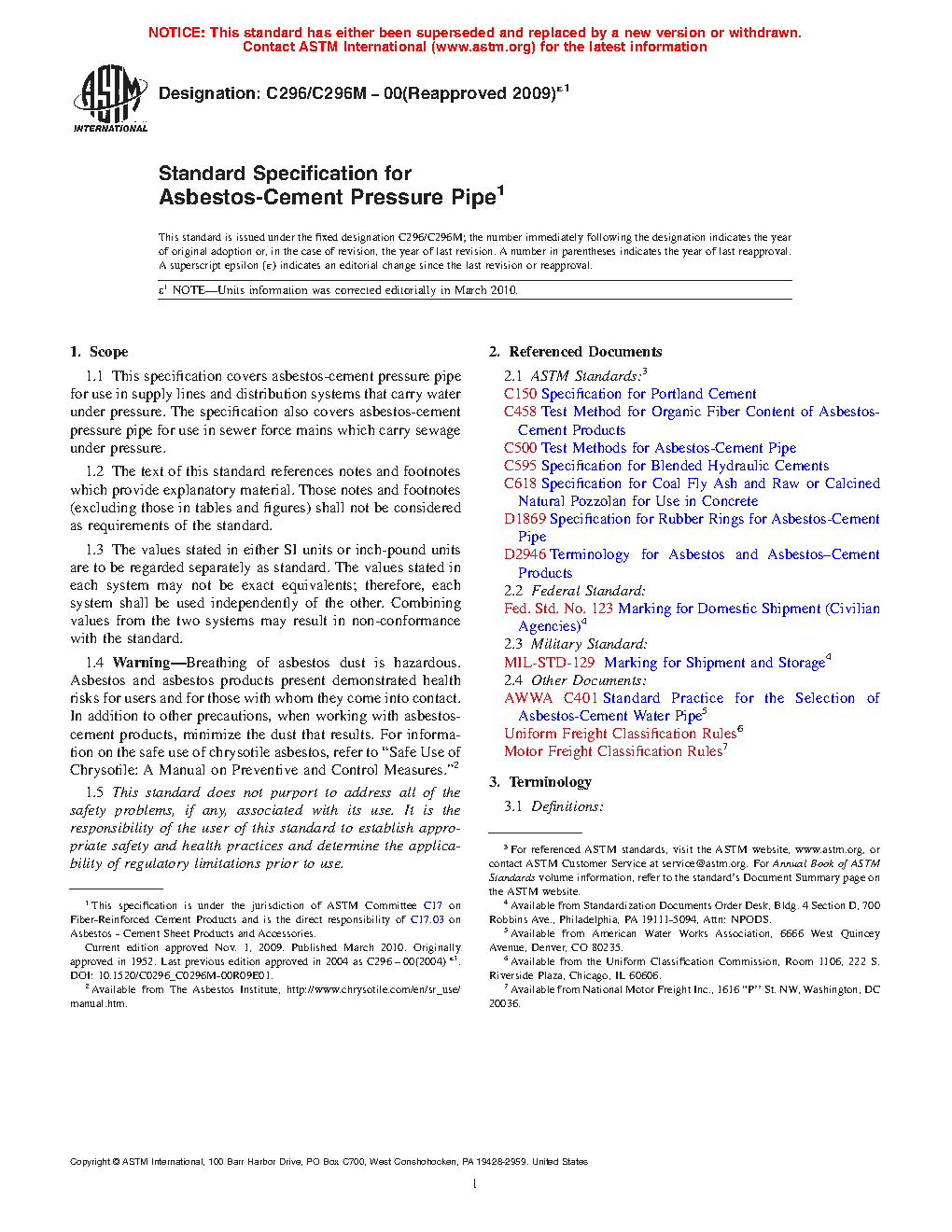 1.4 Warning—Breathing of asbestos dust is hazardous. Asbestos and asbestos products present demonstrated health risks for users and for those with whom they come into contact. In addition to other precautions, when working with asbestos-cement products, minimize the dust that results. For information on the safe use of chrysotile asbestos, refer to “Safe Use of Chrysotile: A Manual on Preventive and Control Measures.”2