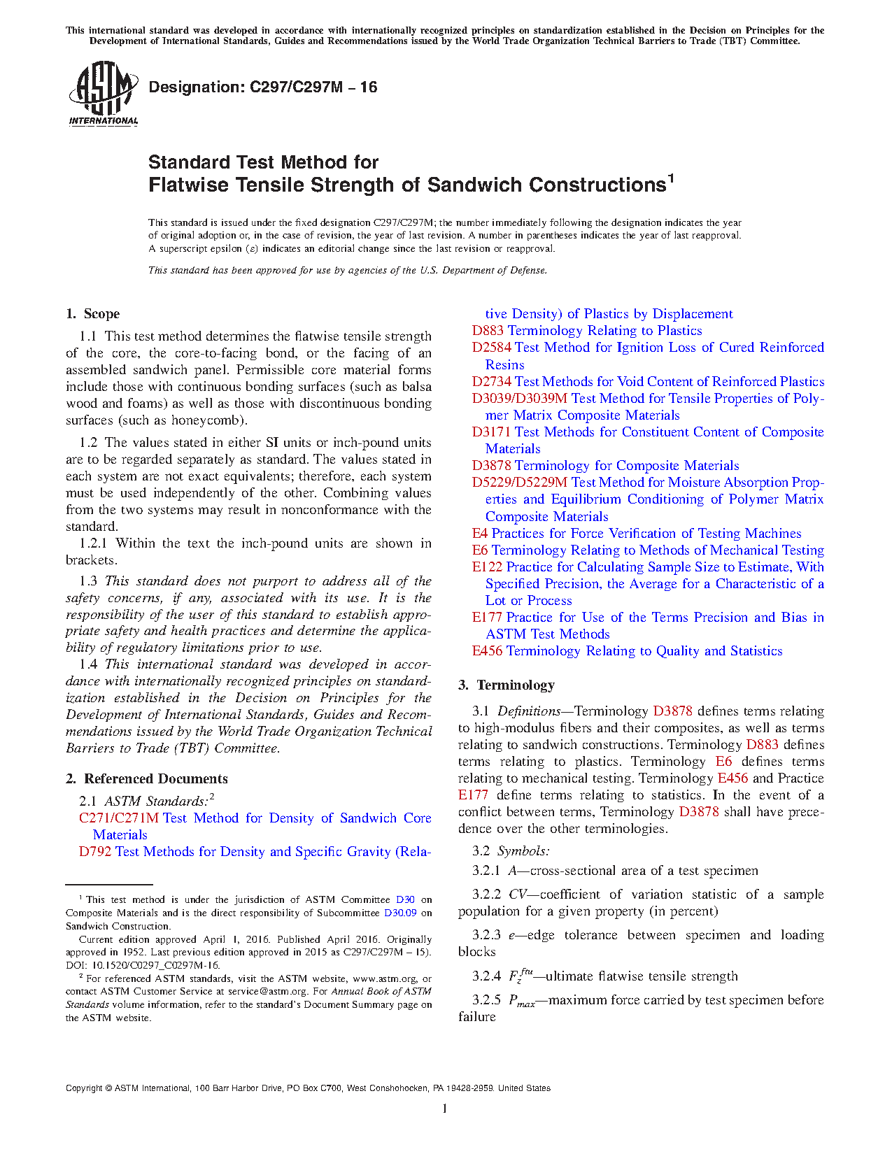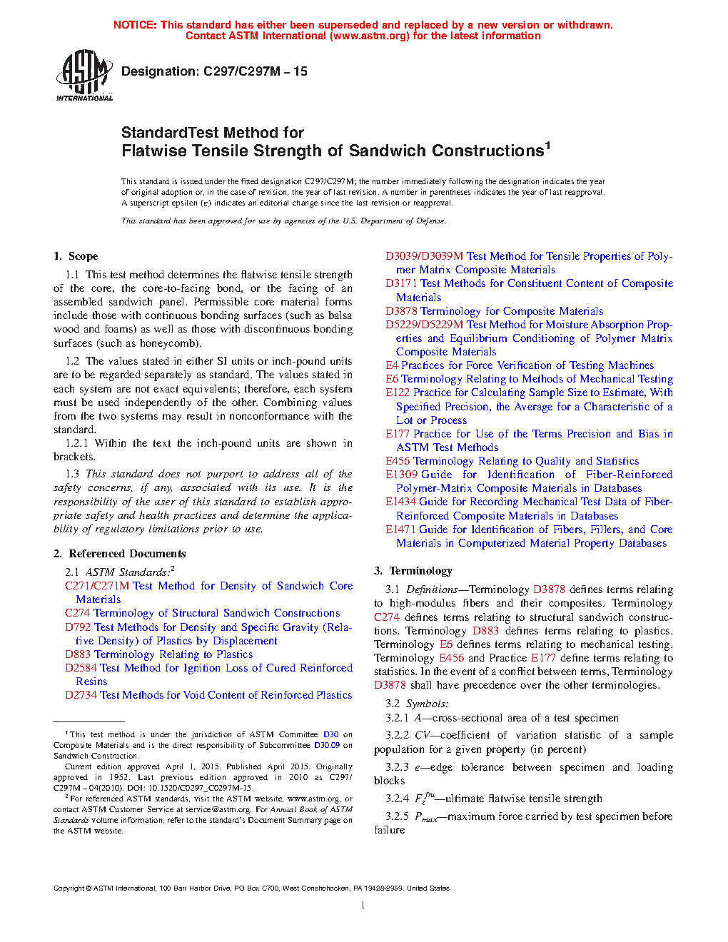 1.1 This test method determines the flatwise tensile strength of the core, the core-to-facing bond, or the facing of an assembled sandwich panel. Permissible core material forms include those with continuous bonding surfaces (such as balsa wood and foams) as well as those with discontinuous bonding surfaces (such as honeycomb).